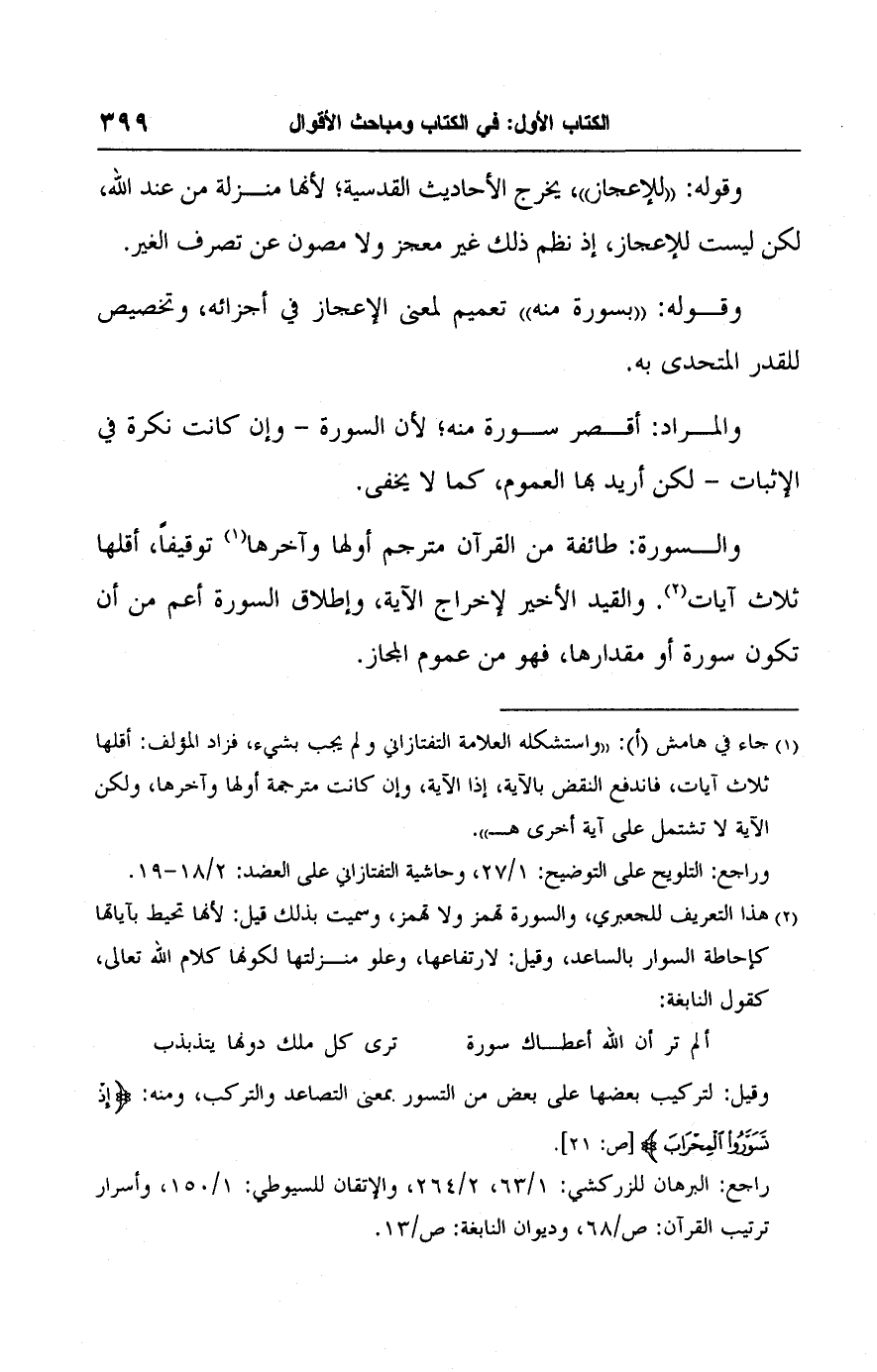 (٢) هذا التعريف للجعبري، والسورة تهمز ولا تهمز، وسميت بذلك قيل: لأنها تحيط بآياتها كإحاطة السوار بالساعد، وقيل: لارتفاعها، وعلو منزلتها لكونها كلام الله تعالى، كقول النابغة: