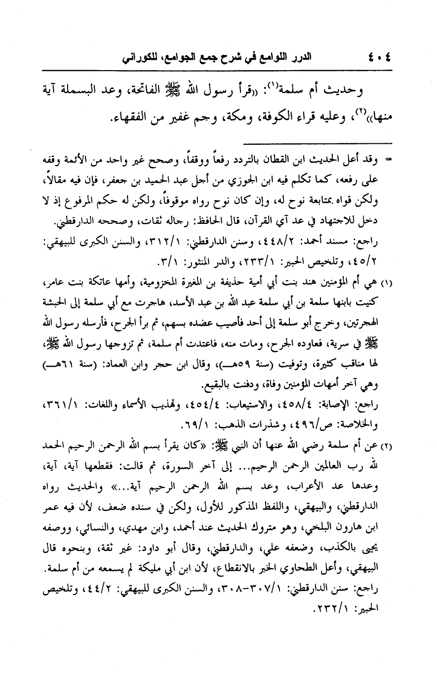 (٢) عن أم سلمة رضى الله عنها أن النبي -صلى الله عليه وسلم-: "كان يقرأ بِسْمِ اللَّهِ الرَّحْمَنِ الرَّحِيمِ الحمد لله رب العالمين الرحمن الرحيم ... إلى آخر السورة، ثم قالت: فقطعها آية، آية، وعدها عد الأعراب، وعد بِسْمِ اللَّهِ الرَّحْمَنِ الرَّحِيمِ آية ... " والحديث رواه الدارقطني، والبيهقي، واللفظ المذكور للأول، ولكن في سنده ضعف، لأن فيه عمر بن هارون البلخي، وهو متروك الحديث عند أحمد، وابن مهدي، والنسائي، ووصفه يحيى بالكذب، وضعفه علي، والدارقطني، وقال أبو داود: غير ثقة، وبنحوه قال البيهقي، وأعل الطحاوي الخبر بالانقطاع، لأن ابن أبي مليكة لم يسمعه من أم سلمة. راجع: سنن الدارقطني: ١/ ٣٠٧ - ٣٠٨، والسنن الكبرى للبيهقي: ٢/ ٤٤، وتلخيص الحبير: ١/ ٢٣٢.