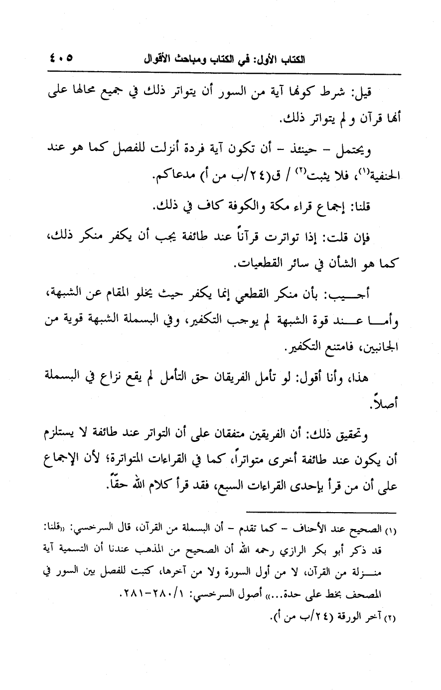 (١) الصحيح عند الأحناف -كما تقدم- أن البسملة من القرآن، قال السرخسي: "قلنا: قد ذكر أبو بكر الرازي رحمه الله أن الصحيح من المذهب عندنا أن التسمية آية منزلة من القرآن، لا من أول السورة ولا من آخرها، كتبت للفصل بين السور في المصحف بخط على حدة ... " أصول السرخسي: ١/ ٢٨٠ - ٢٨١.