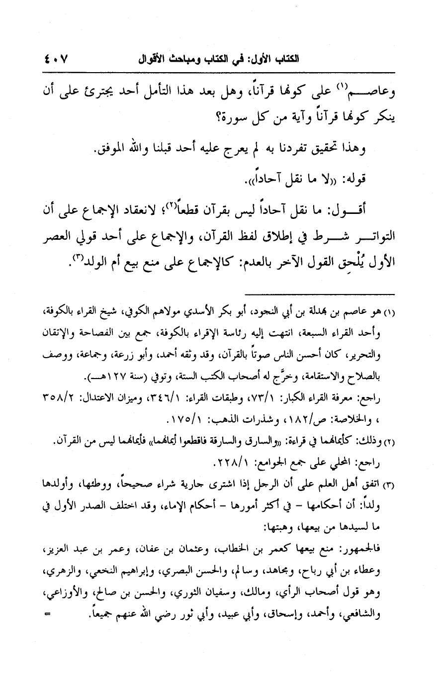 أقول: ما نقل آحادًا ليس بقرآن قطعًا (٢)؛ لانعقاد الإجماع على أن التواتر شرط في إطلاق لفظ القرآن، والإجماع على أحد قولي العصر الأول يُلْحِق القول الآخر بالعدم: كالإجماع على منع بيع أم الولد (٣).
