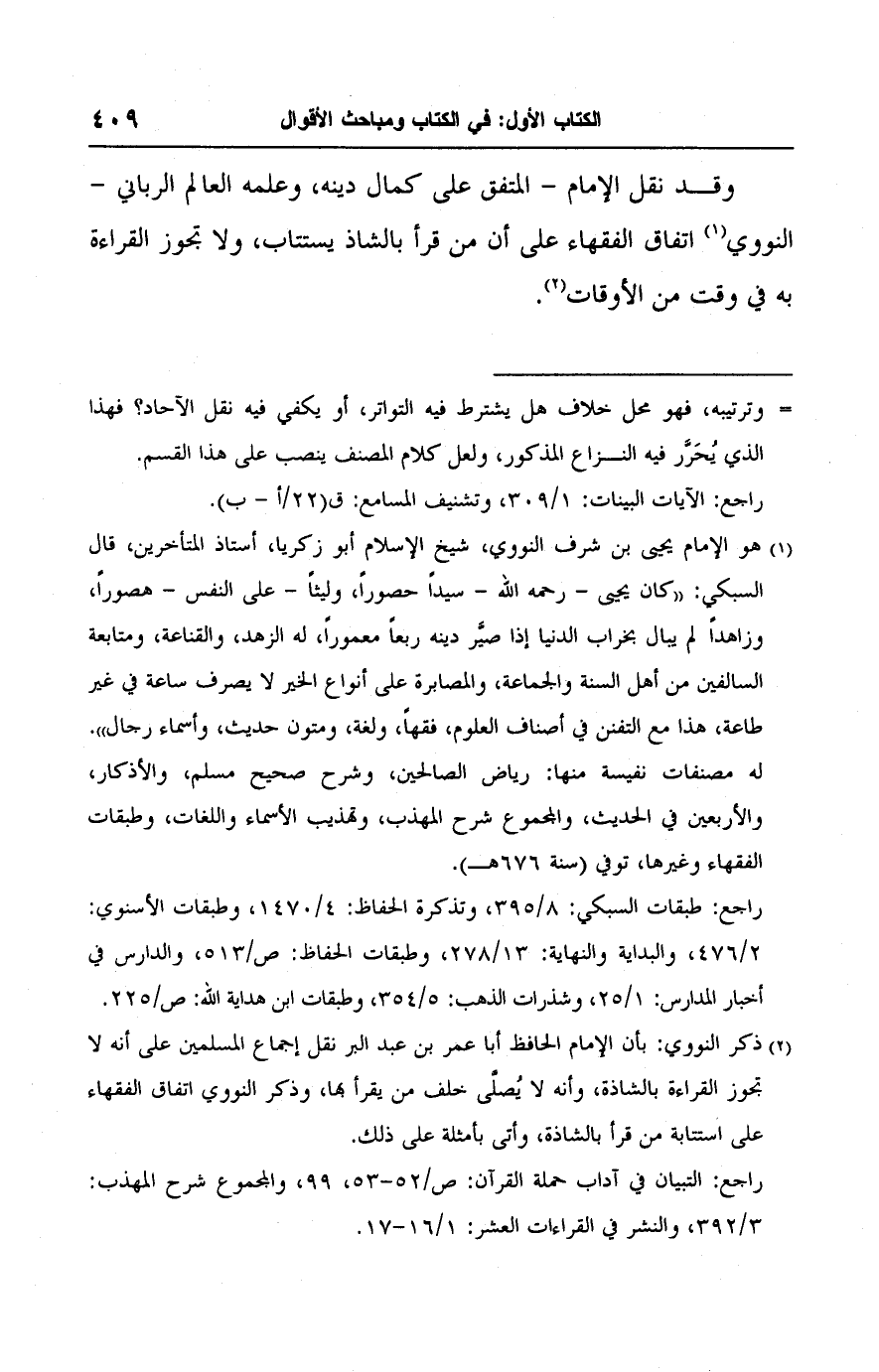 (٢) ذكر النووى: بأن الإمام الحافظ أبا عمر بن عبد البر نقل إجماع المسلمين على أنه لا تجوز القراءة بالشاذة، وأنه لا يُصلَّى خلف من يقرأ بها، وذكر النووي اتفاق الفقهاء على استتابة من قرأ بالشاذة، وأتى بأمثلة على ذلك.