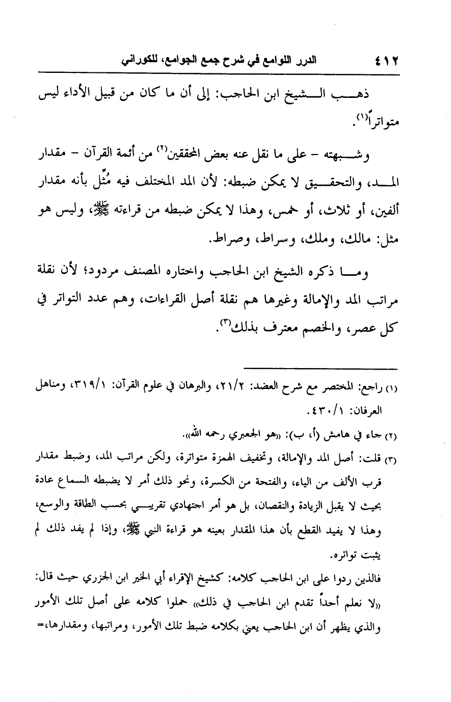 (٣) قلت: أصل المد والإمالة، وتخفيف الهمزة متواترة، ولكن مراتب المد، وضبط مقدار قرب الألف من الياء، والفتحة من الكسرة، ونحو ذلك أمر لا يضبطه السماع عادة بحيث لا يقبل الزيادة والنقصان، بل هو أمر اجتهادي تقريبي بحسب الطاقة والوسع، وهذا لا يفيد القطع بأن هذا المقدار بعينه هو قراءة النبي -صلى الله عليه وسلم-، وإذا لم يفد ذلك لم يثبت تواتره.
