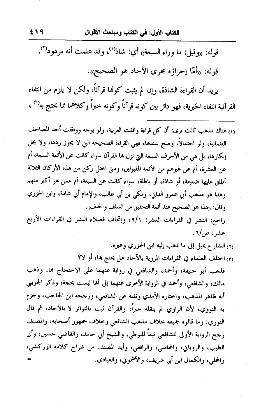 (١) هناك مذهب ثالث يرى: أن كل قراءة وافقت العربية، ولو بوجه ووافقت أحد المصاحف العثمانية، ولو احتمالًا، وصح سندها، فهى القراءة الصحيحة التي لا يجوز ردها، ولا يحل إنكارها، بل هي من الأحرف السبعة التي نزل بها القرآن سواء كانت عن الأئمة السبعة، أم عن العشرة، أم عن غيرهم من الأئمة المقبولين، ومتى اختل ركن من هذه الأركان الثلاثة أطلق عليها ضعيفة، أو شاذة، أو باطلة، سواء كانت عن السبعة، أم عمن هو أكبر منهم وهذا هو مذهب أبي عمرو الداني، ومكي بن أبي طالب، والإمام أبي شامة، وابن الجزري وقال: "هذا هو الصحيح عند أئمة التحقيق من السلف والخلف".