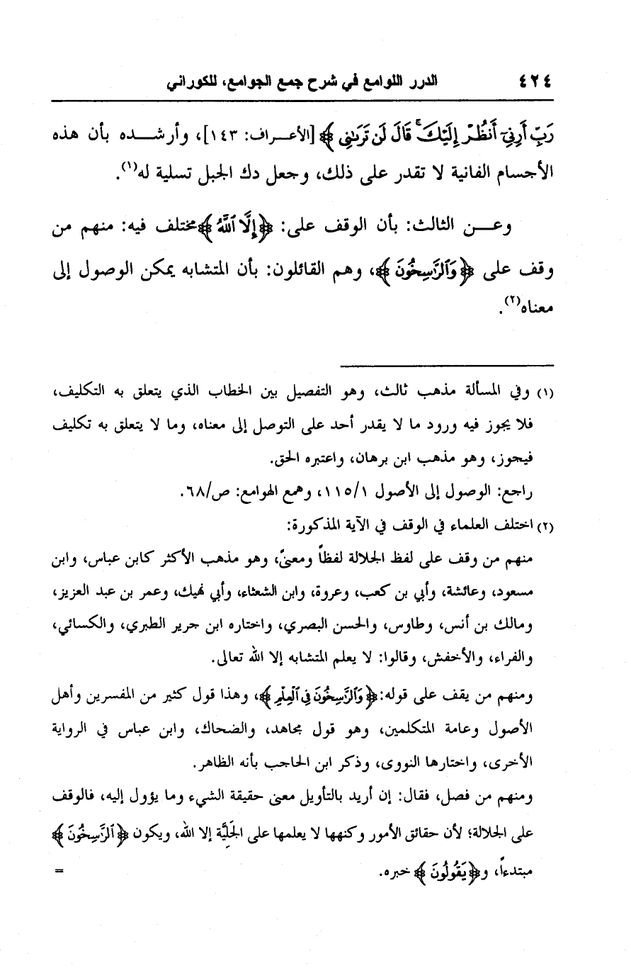 ومنهم من يقف على قوله: {وَالرَّاسِخُونَ فِي الْعِلْمِ}، وهذا قول كثير من المفسرين وأهل الأصول وعامة المتكلمين، وهو قول مجاهد، والضحاك، وابن عباس في الرواية الأخرى، واختارها النووي، وذكر ابن الحاجب بأنه الظاهر.
