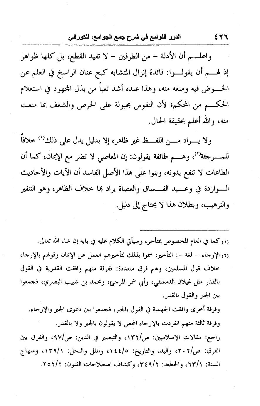 (٢) الإرجاء -لغة-: التأخير، سموا بذلك لتأخيرهم العمل عن الإيمان وقولهم بالإرجاء خلاف قول المسلمين، وهم فرق متعددة: ففرقة منهم وافقت القدرية في القول بالقدر مثل غيلان الدمشقي، وأبي شمر المرجئ، ومحمد بن شبيب البصري، فجمعوا بين الجبر والقول بالقدر.