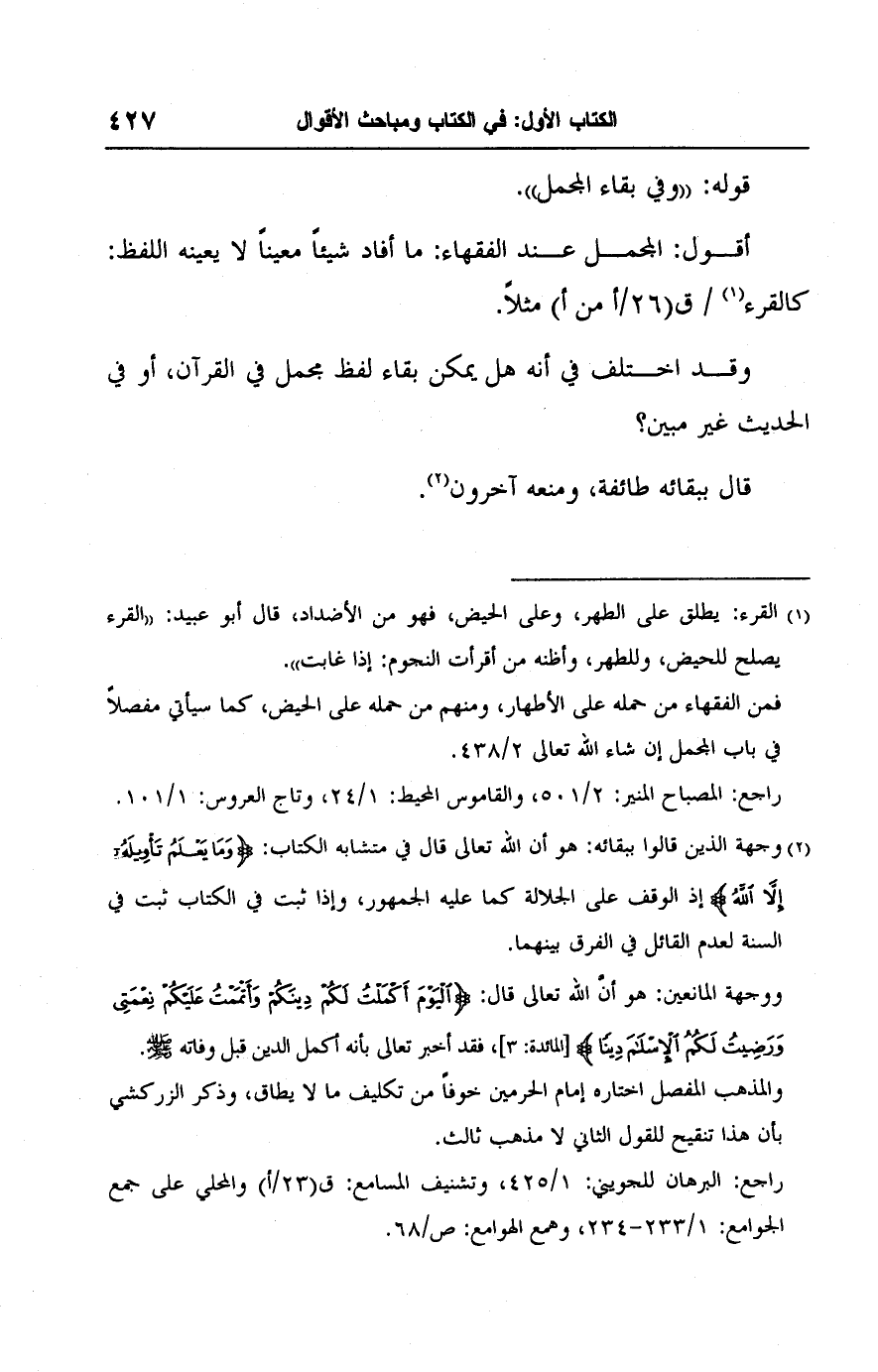 راجع: البرهان للجويني: ١/ ٤٢٥، وتشنيف المسامع: ق (٢٣ / أ) والمحلي على جمع الجوامع: ١/ ٢٣٣ - ٢٣٤، وهمع الهوامع: ص / ٦٨.