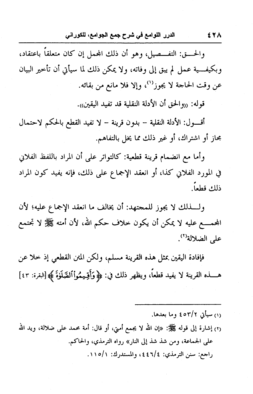 فإفادة اليقين بمثل هذه القرينة مسلم، ولكن المتن القطعي إذ خلا عن هذه القرينة لا يفيد قطعًا، ويظهر ذلك في: {وَأَقِيمُوا الصَّلَاةَ} [البقرة: ٤٣]
