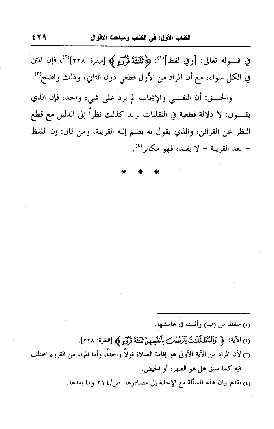(٣) لأن المراد من الآية الأولى هو إقامة الصلاة قولًا واحدًا، وأما المراد من القروء اختلف فيه كما سبق هل هو الطهر، أو الحيض.