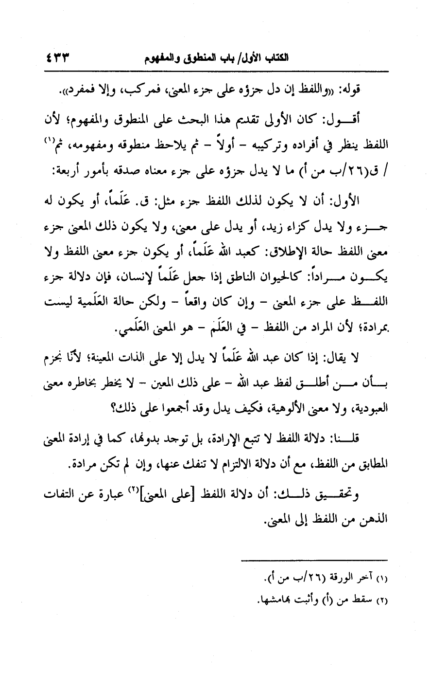 أقول: كان الأولى تقديم هذا البحث على المنطوق والمفهوم؛ لأن اللفظ ينظر في أفراده وتركيبه -أولًا- ثم يلاحظ منطوقه ومفهومه، ثم (١) ما لا يدل جزؤه على جزء معناه صدقه بأمور أربعة:
