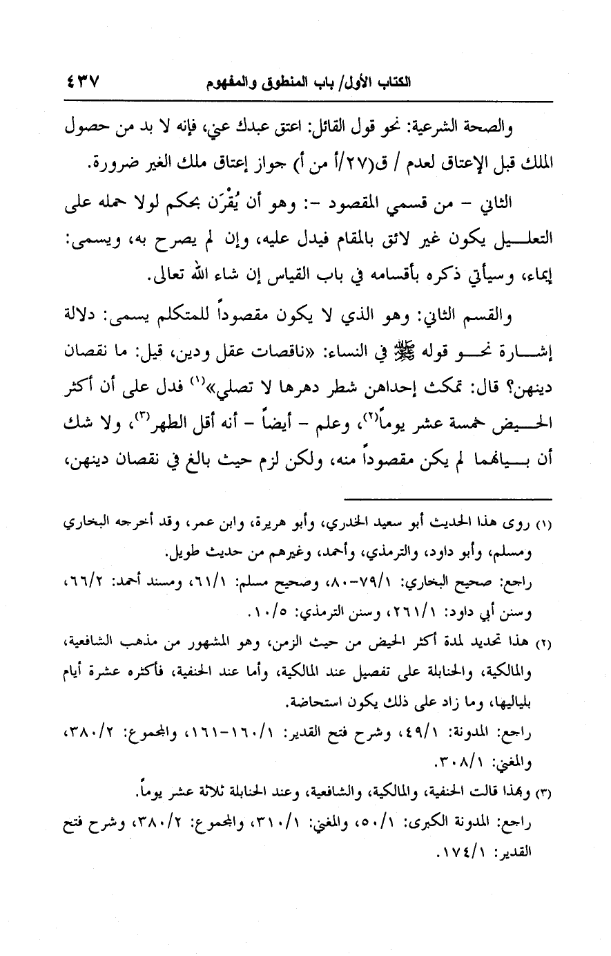 والقسم الثاني: وهو الذي لا يكون مقصودًا للمتكلم يسمى: دلالة إشارة نحو قوله -صلى الله عليه وسلم- في النساء: "ناقصات عقل ودين، قيل: ما نقصان دينهن؟ قال: تمكث إحداهن شطر دهرها لا تصلى" (١) فدل على أن أكثر الحيض خمسة عشر يومًا (٢)، وعلم -أيضًا- أنه أقل الطهر (٣)، ولا شك أن بيانهما لم يكن مقصودًا منه، ولكن لزم حيث بالغ في نقصان دينهن،