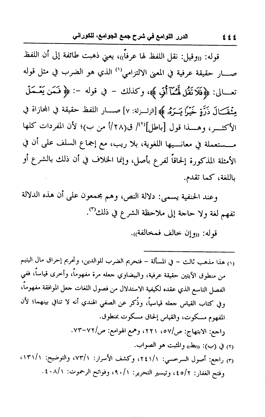 (٣) راجع: أصول السرخسي: ١/ ٢٤١، وكشف الأسرار: ١/ ٧٣، والتوضيح: ١/ ١٣١، وفتح الغفار: ٢/ ٤٥، وتيسير التحرير: ١/ ٩٠، وفواتح الرحموت: ١/ ٤٠٨.