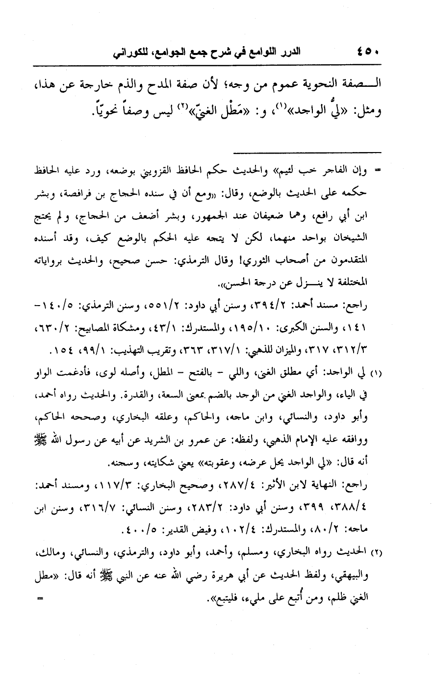 (١) لي الواجد: أي مطلق الغنى، واللي -بالفتح- المطل، وأصله لوى، فأدغمت الواو في الياء، والواجد الغني من الوجد بالضم بمعنى السعة، والقدرة. والحديت رواه أحمد، وأبو داود، والنسائي، وابن ماجه، والحاكم، وعلقه البخاري، وصححه الحاكم، ووافقه عليه الإمام الذهبي، ولفظه: عن عمرو بن الشريد عن أبيه عن رسول الله -صلى الله عليه وسلم- أنه قال: "لي الواجد يحل عرضه، وعقوبته" يعني شكايته، وسجنه.
