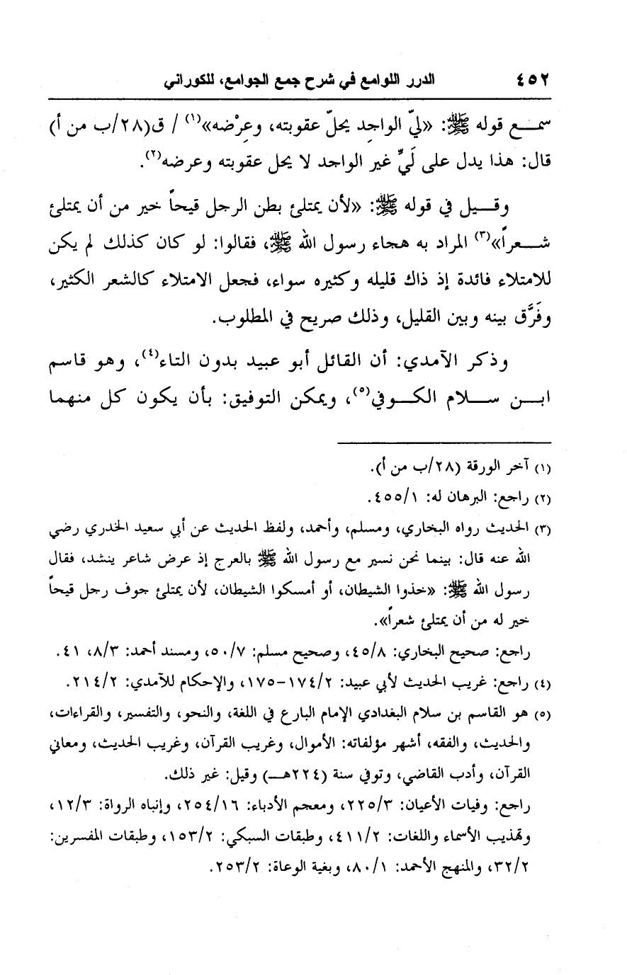 (٣) الحديث رواه البخاري، ومسلم، وأحمد، ولفظ الحديث عن أبي سعيد الخدري رضي الله عنه قال: بينما نحن نسير مع رسول الله -صلى الله عليه وسلم- بالعرج إذ عرض شاعر ينشد، فقال رسول الله -صلى الله عليه وسلم-: "خذوا الشيطان، أو أمسكوا الشيطان، لأن يمتلئ جوف رجل قيحًا خير له من أن يمتلئ شعرًا".