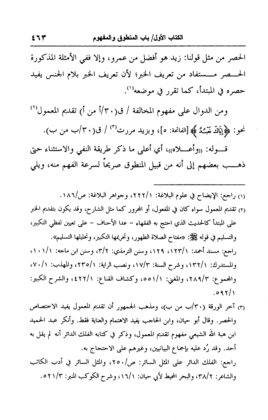 (٣) آخر الورقة (٣٠ / ب من ب)، ومذهب الجمهور أن تقديم المعمول يفيد الاختصاص والحصر. وقال أبو حيان، وابن الحاجب يفيد الاهتمام والعناية فقط. وأنكر عبد الحميد ابن هبة الله الشيعي مفهوم تقديم المعمول، وذكر في كتابه الفلك الدائر أنه لم يقل به أحد. وقد رُد عليه بإجماع البيانيين، وغيرهم على الاحتجاج به.