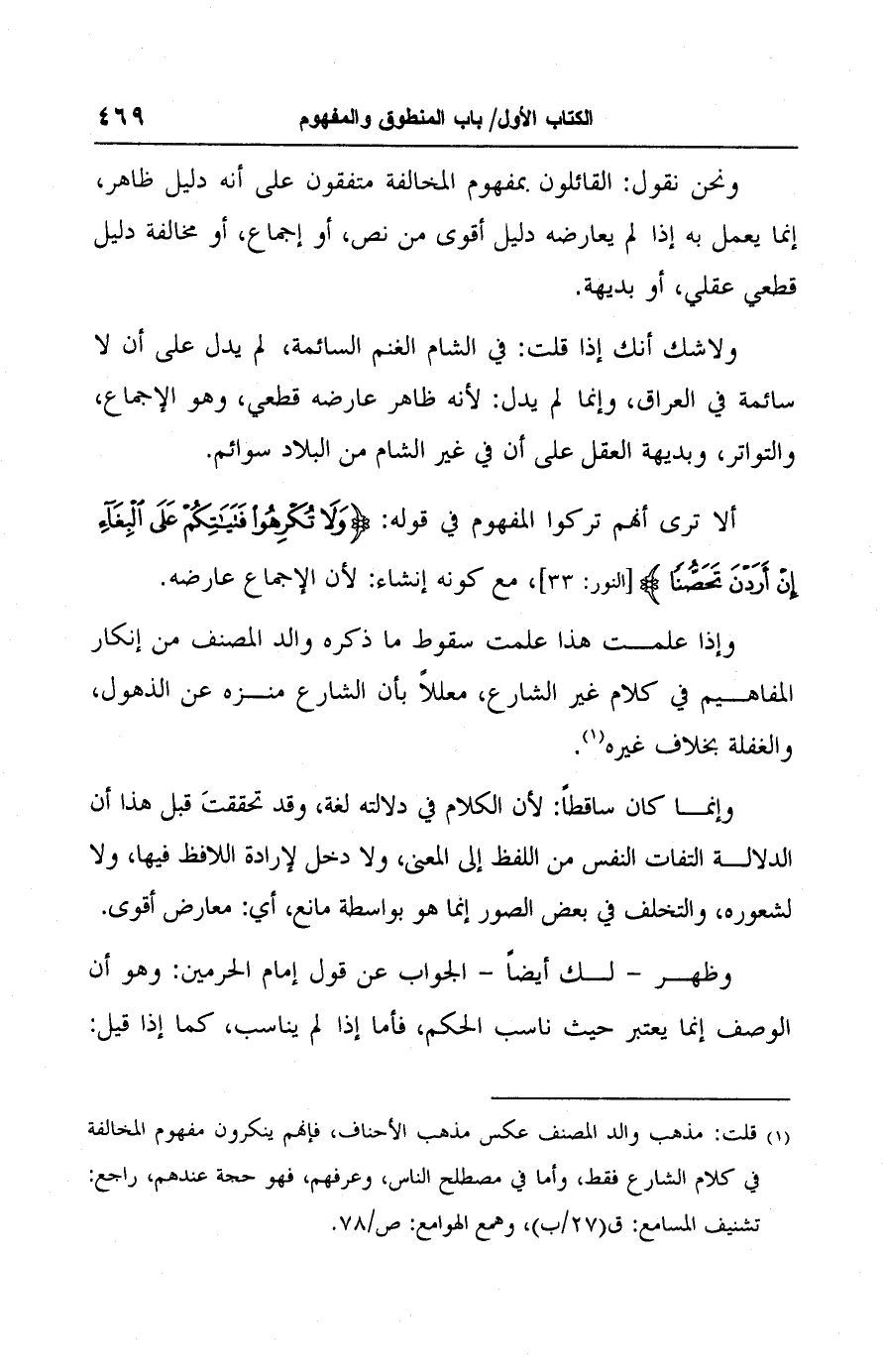 (١) قلت: مذهب والد المصنف عكس مذهب الأحناف، فإنهم ينكرون مفهوم المخالفة في كلام الشارع فقط، وأما في مصطلح الناس، وعرفهم، فهو حجة عندهم، راجع: تشنيف المسامع: ق (٢٧ / ب)، وهمع الهوامع: ص / ٧٨.