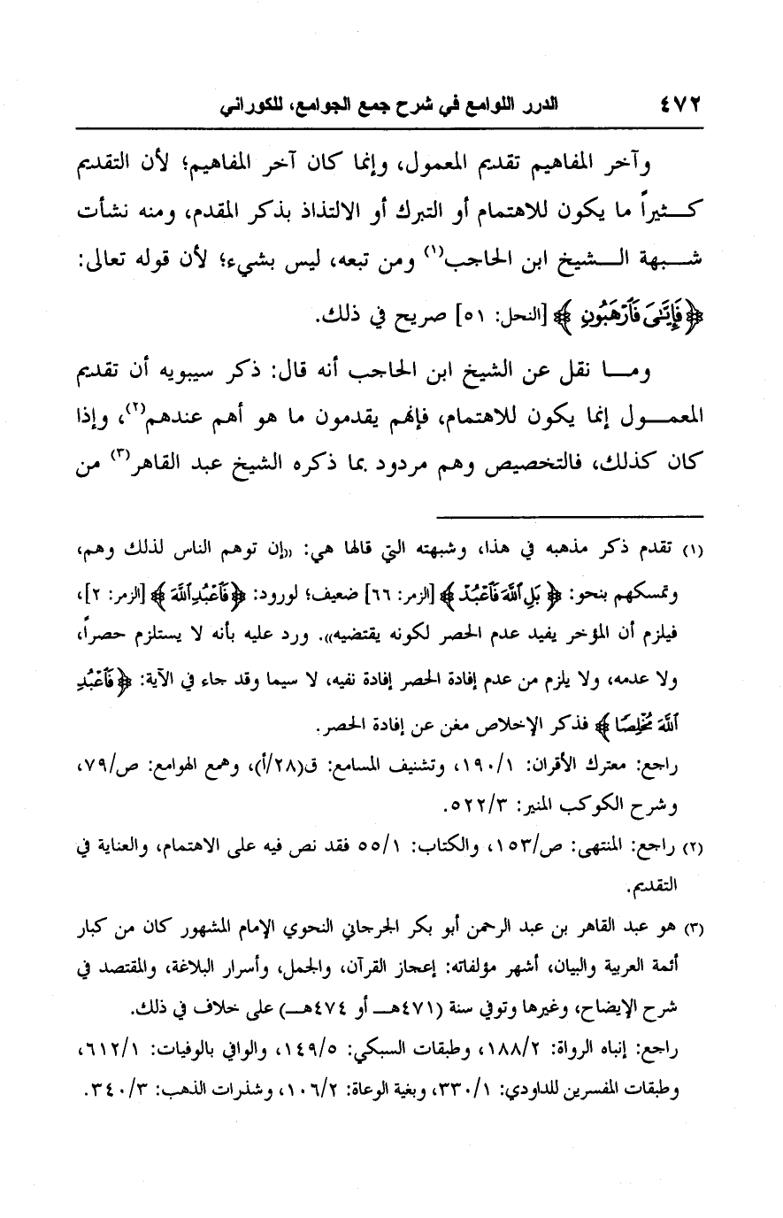 (٣) هو عبد القاهر بن عبد الرحمن أبو بكر الجرحاني النحوي الإمام المشهور كان من كبار أئمة العربية والبيان، أشهر مؤلفاته: إعجاز القرآن، والجمل، وأسرار البلاغة، والمقتصد في شرح الإيضاح، وغيرها وتوفي سنة (٤٧١ هـ أو ٤٧٤ هـ) على خلاف في ذلك.