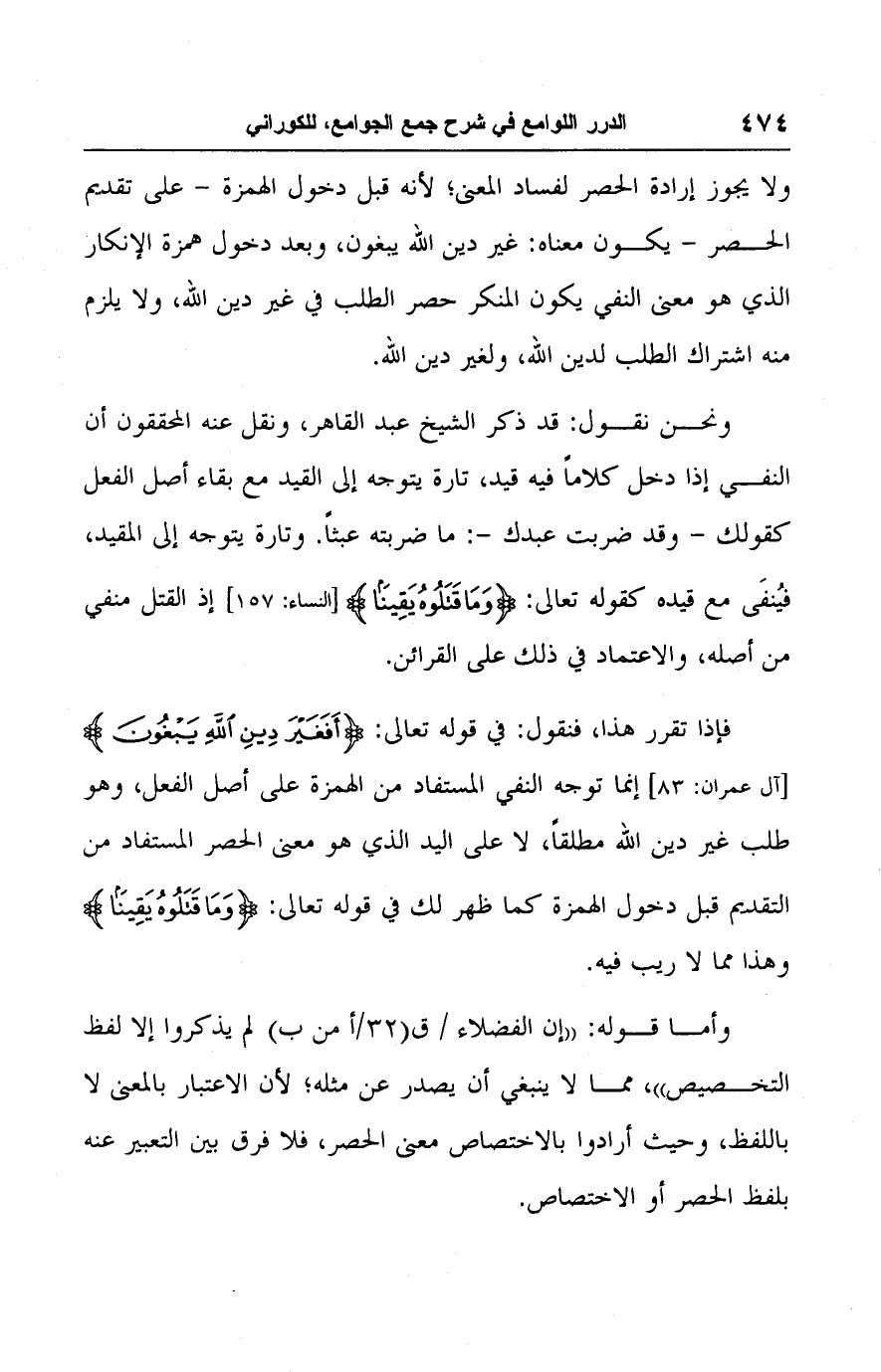 فإذا تقرر هذا، فنقول: في قوله تعالى: {أَفَغَيْرَ دِينِ اللَّهِ يَبْغُونَ} [آل عمران: ٨٣] إنما توجه النفي المستفاد من الهمزة على أصل الفعل، وهو طلب غير دين الله مطلقًا، لا على اليد الذي هو معنى الحصر المستفاد من التقديم قبل دخول الهمزة كما ظهر لك في قوله تعالى: {وَمَا قَتَلُوهُ يَقِينًا} وهذا مما لا ريب فيه.