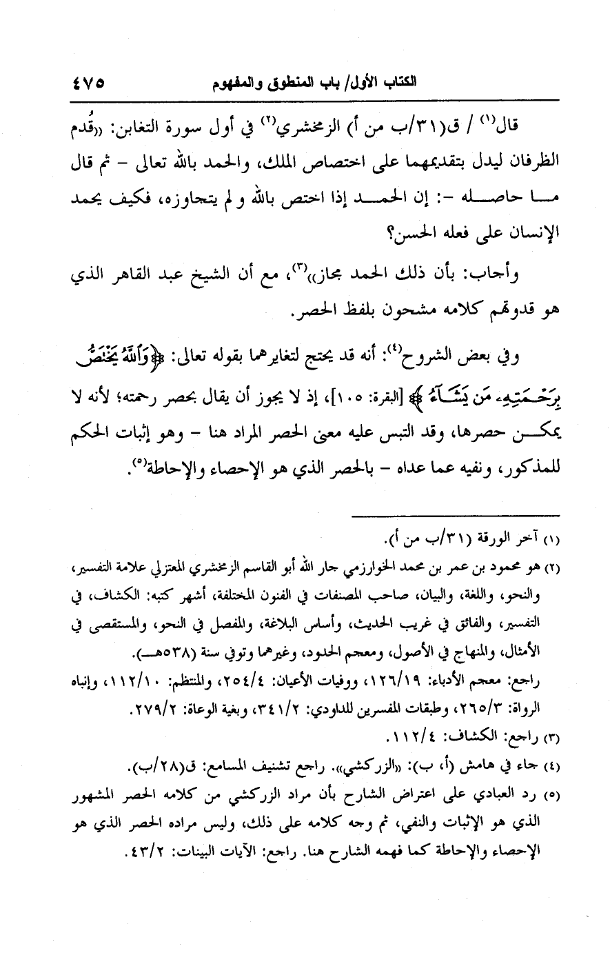 وأجاب: بأن ذلك الحمد مجاز" (٣)، مع أن الشيخ عبد القاهر الذي هو قدوتهم كلامه مشحون بلفظ الحصر.