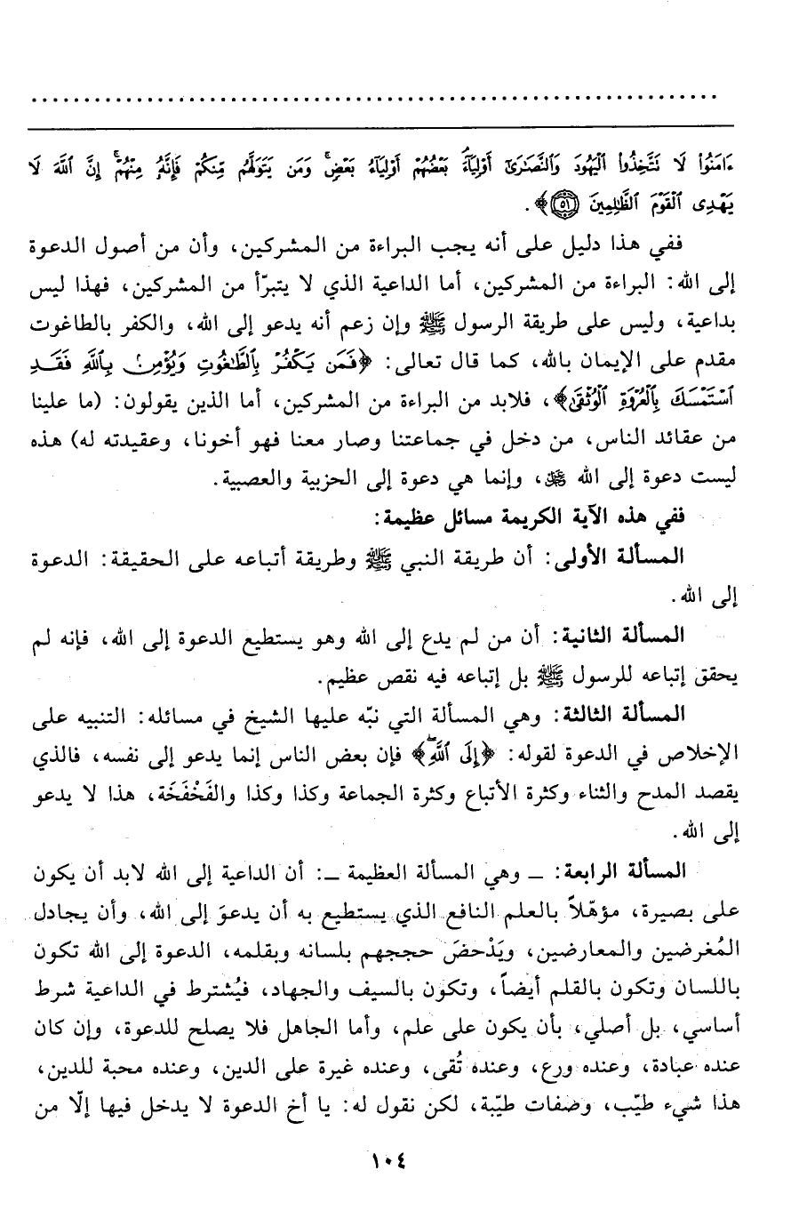المسألة الثالثة: وهي المسألة التي نبّه عليها الشيخ في مسائله: التنبيه على الإخلاص في الدعوة لقوله: {إِلى اللهِ} فإن بعض الناس إنما يدعو إلى نفسه، فالذي يقصد المدح والثناء وكثرة الأتباع وكثرة الجماعة وكذا وكذا والفَخْفَخَة، هذا لا يدعو إلى الله.