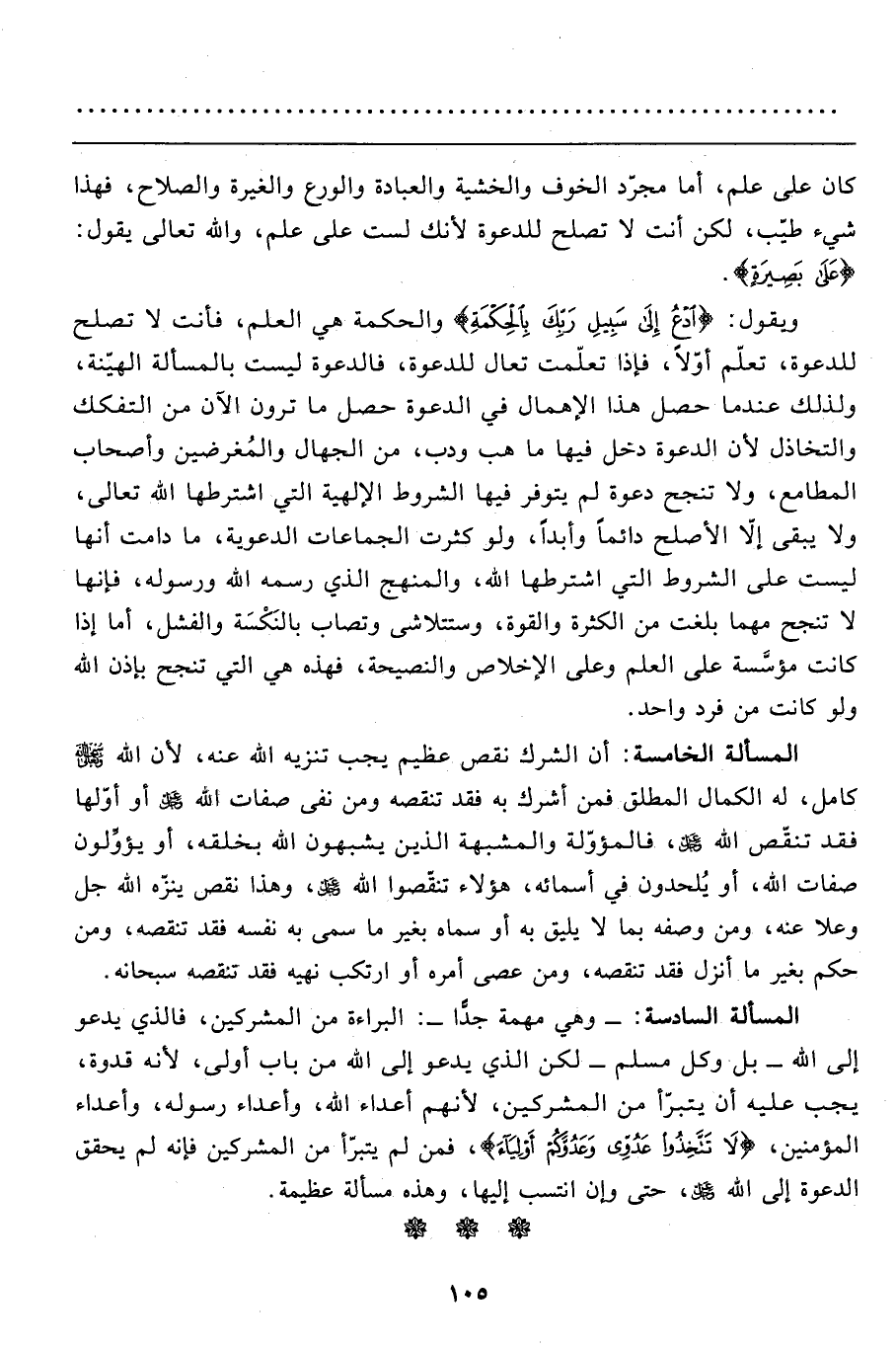 المسألة السادسة:- وهي مهمة جدًّا-: البراءة من المشركين، فالذي يدعو إلى الله -بل وكل مسلم- لكن الذي يدعو إلى الله من باب أولى، لأنه قدوة، يجب عليه أن يتبرّأ من المشركين، لأنهم أعداء الله، وأعداء رسوله، وأعداء المؤمنين، {لا تَتَّخِذُوا عَدُوِّي وَعَدُوَّكُمْ أَوْلِيَاءَ} ، فمن لم يتبرأ من المشركين فإنه لم يحقق الدعوة إلى الله عزّ وجلّ، حتى وإن انتسب إليها، وهذه مسألة عظيمة.