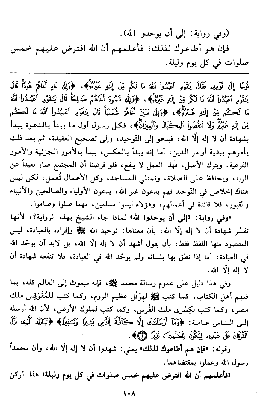 نُوحاً إِلَى قَوْمِهِ فَقَالَ يَا قَوْمِ اعْبُدُوا اللهَ مَا لَكُمْ مِنْ إِلَهٍ غَيْرُهُ} ، {وَإِلَى عَادٍ أَخَاهُمْ هُوداً قَالَ يَا قَوْمِ اعْبُدُوا اللهَ مَا لَكُمْ مِنْ إِلَهٍ غَيْرُهُ} ، {وَإِلَى ثَمُودَ أَخَاهُمْ صَالِحاً قَالَ يَا قَوْمِ اعْبُدُوا اللهَ مَا لَكُمْ مِنْ إِلَهٍ غَيْرُهُ} ، {وَإِلَى مَدْيَنَ أَخَاهُمْ شُعَيْباً قَالَ يَا قَوْمِ اعْبُدُوا اللهَ مَا لَكُمْ مِنْ إِلَهٍ غَيْرُهُ وَلا تَنْقُصُوا الْمِكْيَالَ وَالْمِيزَانَ} ، فكل رسول أول ما يبدأ بالدعوة يبدأ بشهادة أن لا إله إلاَّ الله، فيدعو إلى التّوحيد، وإلى تصحيح العقيدة، ثم بعد ذلك يأمرهم ببقية أوامر الدين، أما إنه يبدأ بالعكس، يبدأ بالأمور الجزئية والأمور الفرعية، ويترك الأصل، فهذا العمل لا ينفع، فلو فرضنا أن المجتمع صار بعيداً عن الربا، ويحافظ على الصلاة، وتمتلئ المساجد، وكل الأعمال تُعمل، لكن ليس هناك إخلاص في التّوحيد فهم يدعون غير الله، يدعون الأولياء والصالحين والأنبياء والقبور، فلا فائدة في أعمالهم، وهؤلاء ليسوا مسلمين، مهما صلوا وصاموا.
