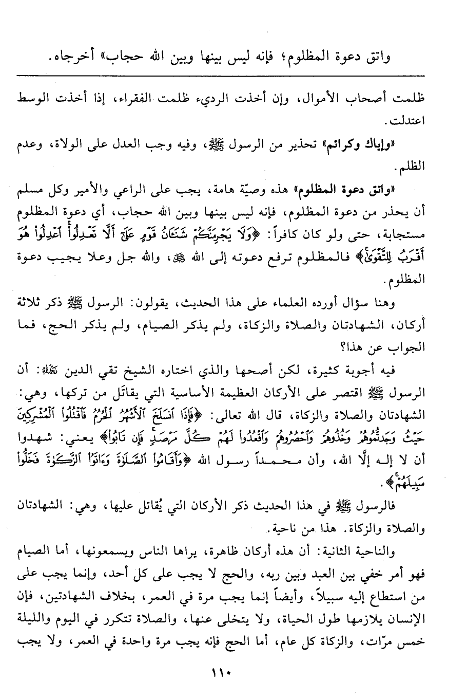 "واتق دعوة المظلوم" هذه وصيّة هامة، يجب على الراعي والأمير وكل مسلم أن يحذر من دعوة المظلوم، فإنه ليس بينها وبين الله حجاب، أي دعوة المظلوم مستجابة، حتى ولو كان كافراً: {وَلا يَجْرِمَنَّكُمْ شَنَآنُ قَوْمٍ عَلَى أَلَّا تَعْدِلُوا اعْدِلُوا هُوَ أَقْرَبُ لِلتَّقْوَى} فالمظلوم ترفع دعوته إلى الله عزّ وجلّ، والله جل وعلا يجيب دعوة المظلوم.