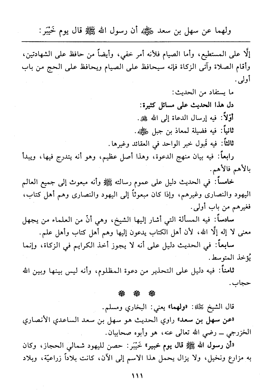 ولهما عن سهل بن سعد رضي الله عنه أن رسول الله صَلَّى اللَّهُ عَلَيْهِ وَسَلَّمَ قال يوم خَيْبَر: