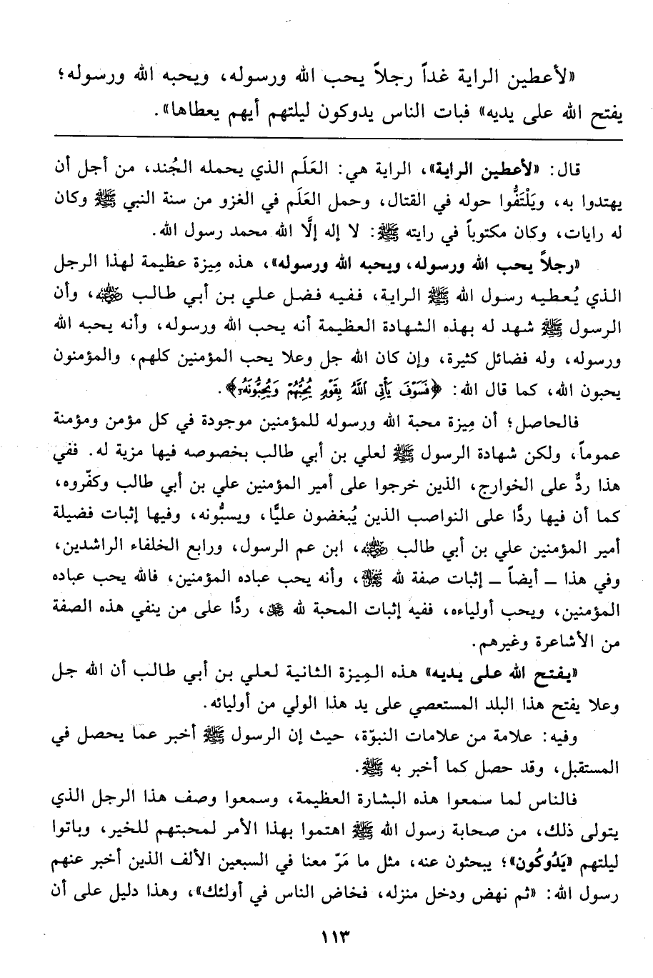 "لأعطين الراية غداً رجلاً يحب الله ورسوله، ويحبه الله ورسوله؛ يفتح الله على يديه" فبات الناس يدوكون ليلتهم أيهم يعطاها".