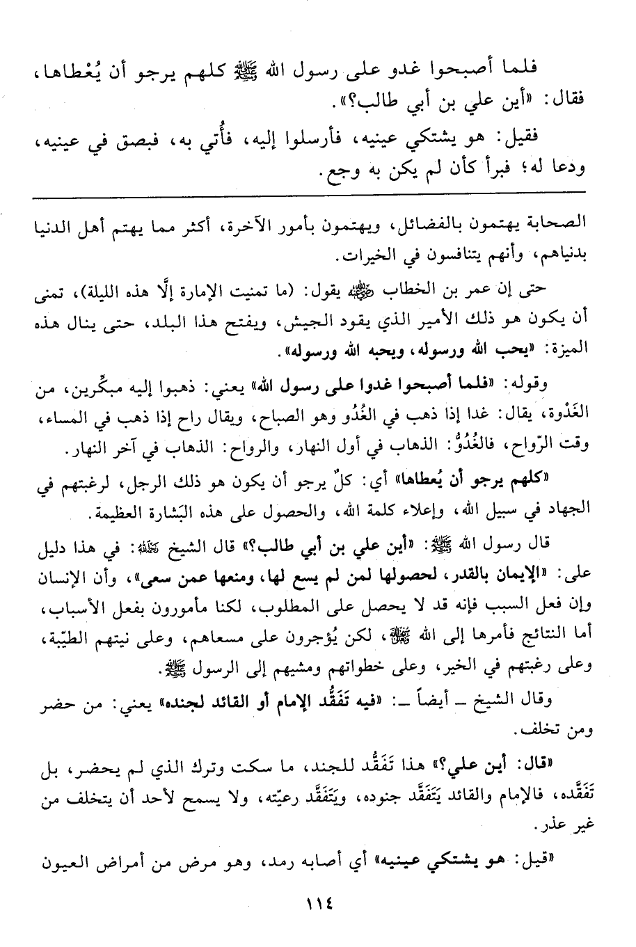 قال رسول الله صَلَّى اللَّهُ عَلَيْهِ وَسَلَّمَ: "أين علي بن أبي طالب؟ " قال الشيخ رحمه الله: في هذا دليل على: "الإيمان بالقدر، لحصولها لمن لم يسع لها، ومنعها عمن سعى"، وأن الإنسان وإن فعل السبب فإنه قد لا يحصل على المطلوب، لكنا مأمورون بفعل الأسباب، أما النتائج فأمرها إلى الله سبحانه وتعالى، لكن يُؤجرون على مسعاهم، وعلى نيتهم الطيّبة، وعلى رغبتهم في الخير، وعلى خطواتهم ومشيهم إلى الرسول صَلَّى اللَّهُ عَلَيْهِ وَسَلَّمَ.