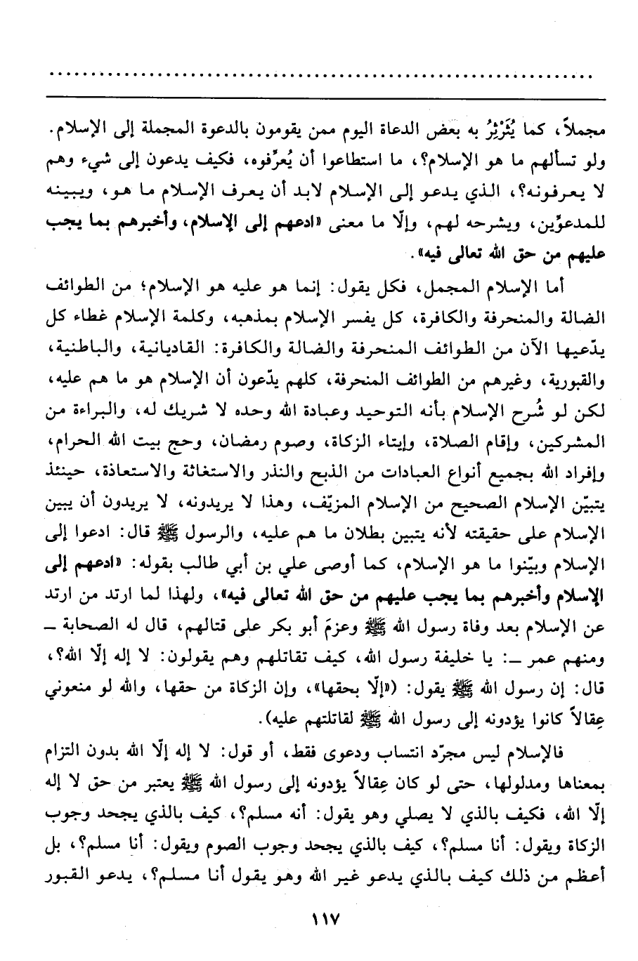 أما الإسلام المجمل، فكل يقول: إنما هو عليه هو الإسلام؛ من الطوائف الضالة والمنحرفة والكافرة، كل يفسر الإسلام بمذهبه، وكلمة الإسلام غطاء كل يدّعيها الآن من الطوائف المنحرفة والضالة والكافرة: القاديانية، والباطنية، والقبورية، وغيرهم من الطوائف المنحرفة، كلهم يدّعون أن الإسلام هو ما هم عليه، لكن لو شُرح الإسلام بأنه التّوحيد وعبادة الله وحده لا شريك له، والبراءة من المشركين، وإقام الصلاة، وإيتاء الزكاة، وصوم رمضان، وحج بيت الله الحرام، وإفراد الله بجميع أنواع العبادات من الذبح والنذر والاستغاثة والاستعاذة، حينئذٍ يتبيّن الإسلام الصحيح من الإسلام المزيّف، وهذا لا يريدونه، لا يريدون أن يبين الإسلام على حقيقته لأنه يتبين بطلان ما هم عليه، والرسول صَلَّى اللَّهُ عَلَيْهِ وَسَلَّمَ قال: ادعوا إلى الإسلام وبيّنوا ما هو الإسلام، كما أوصى علي بن أبي طالب بقوله: "ادعهم إلى الإسلام وأخبرهم بما يجب عليهم من حق الله تعالى فيه"، ولهذا لما ارتد من ارتد عن الإسلام بعد وفاة رسول الله صَلَّى اللَّهُ عَلَيْهِ وَسَلَّمَ وعزمَ أبو بكر على قتالهم، قال له الصحابة -ومنهم عمر-: يا خليفة رسول الله، كيف تقاتلهم وهم يقولون: لا إله إلاَّ الله؟، قال؟ إن رسول الله صَلَّى اللَّهُ عَلَيْهِ وَسَلَّمَ يقول: ("إلاَّ بحقها"، وإن الزكاة من حقها، والله لو منعوني عقالاً كانوا يؤدونه إلى رسول الله صَلَّى اللَّهُ عَلَيْهِ وَسَلَّمَ لقاتلتهم عليه) .