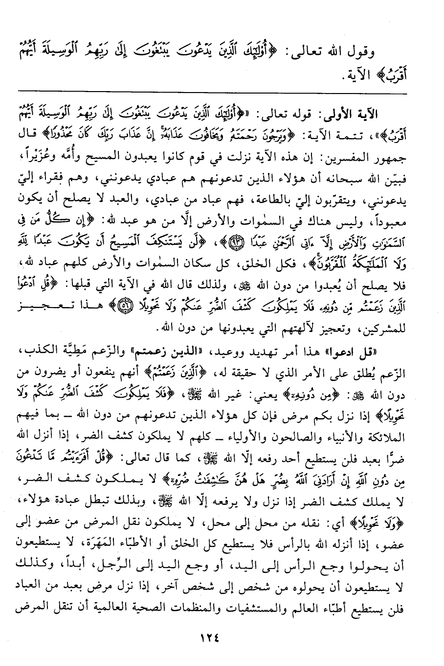 الآية الأولى: قوله تعالى: {أُولَئِكَ الَّذِينَ يَدْعُونَ يَبْتَغُونَ إِلَى رَبِّهِمُ الْوَسِيلَةَ أَيُّهُمْ أَقْرَبُ} "، تتمة الآية: {وَيَرْجُونَ رَحْمَتَهُ وَيَخَافُونَ عَذَابَهُ إِنَّ عَذَابَ رَبِّكَ كَانَ مَحْذُوراً} قال جمهور المفسرين: إن هذه الآية نزلت في قوم كانوا يعبدون المسيح وأُمَّه وعُزَيْراً، فبيّن الله سبحانه أن هؤلاء الذين تدعونهم هم عبادي يدعونني، وهم فقراء إليّ يدعونني، ويتقربون إليّ بالطاعة، فهم عباد من عبادي، والعبد لا يصلح أن يكون معبوداً، وليس هناك في السموات والأرض إلاَّ من هو عبد لله: {إِنْ كُلُّ مَنْ فِي السَّمَاوَاتِ وَالأَرْضِ إِلاَّ آتِي الرَّحْمَنِ عَبْداً (93) } ، {لَنْ يَسْتَنْكِفَ الْمَسِيحُ أَنْ يَكُونَ عَبْداً لِلَّهِ وَلا الْمَلائِكَةُ الْمُقَرَّبُونَ} ، فكل الخلق، كل سكان السموات والأرض كلهم عباد لله، فلا يصلح أن يُعبدوا من دون الله عزّ وجلّ، ولذلك قال الله في الآية التي قبلها: {قُلِ ادْعُوا الَّذِينَ زَعَمْتُمْ مِنْ دُونِهِ فَلا يَمْلِكُونَ كَشْفَ الضُّرِّ عَنْكُمْ وَلا تَحْوِيلاً (56) } هذا تعجيز للمشركين، وتعجيز لآلهتهم التي يعبدونها من دون الله.