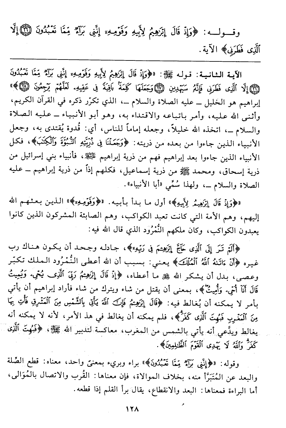 الآية الثانية: قوله سبحانه وتعالى: " {وَإِذْ قَالَ إِبْرَاهِيمُ لِأَبِيهِ وَقَوْمِهِ إِنَّنِي بَرَاءٌ مِمَّا تَعْبُدُونَ (26) إِلَّا الَّذِي فَطَرَنِي فَإِنَّهُ سَيَهْدِينِ (27) وَجَعَلَهَا كَلِمَةً بَاقِيَةً فِي عَقِبِهِ لَعَلَّهُمْ يَرْجِعُونَ (28) } " إبراهيم هو الخليل- عليه الصلاة والسلام-، الذي تكرّر ذكره في القرآن الكريم، وأثنى الله عليه، وأمر باتباعه والاقتداء به، وهو أبو الأنبياء- عليه الصلاة والسلام-، اتخذه الله خليلاً، وجعله إماماً للناس، أي: قُدوة يُقتدى به، وجعل الأنبياء الذين جاءوا من بعده من ذريته: {وَجَعَلْنَا فِي ذُرِّيَّتِهِ النُّبُوَّةَ وَالْكِتَابَ} ، فكل الأنبياء الذين جاءوا بعد إبراهيم فهم من ذرية إبراهيم عليه السلام، فأنبياء بني إسرائيل من ذرية إسحاق، ومحمد صَلَّى اللَّهُ عَلَيْهِ وَسَلَّمَ من ذرية إسماعيل، فكلهم إذاً من ذرية إبراهيم- عليه الصلاة والسلام-، ولهذا سُمِّي "أبا الأنبياء".