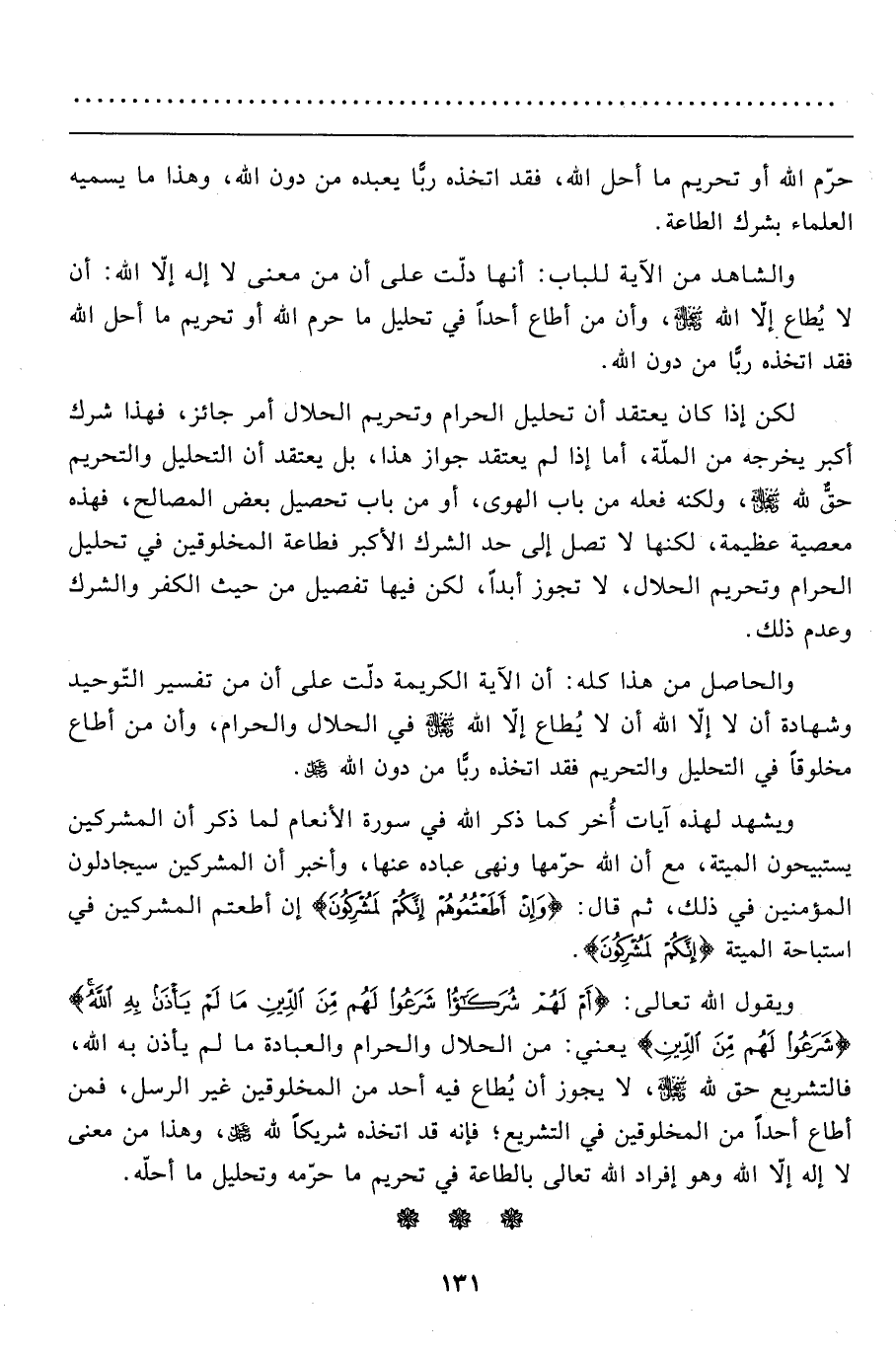 ويشهد لهذه آيات أخر كما ذكر الله في سورة الأنعام لما ذكر أن المشركين يستبيحون الميتة، مع أن الله حرّمها ونهى عباده عنها، وأخبر أن المشركين سيجادلون المؤمنين في ذلك، ثم قال: {وَإِنْ أَطَعْتُمُوهُمْ إِنَّكُمْ لَمُشْرِكُونَ} إن أطعتم المشركين في استباحة الميتة {إِنَّكُمْ لَمُشْرِكُونَ} .