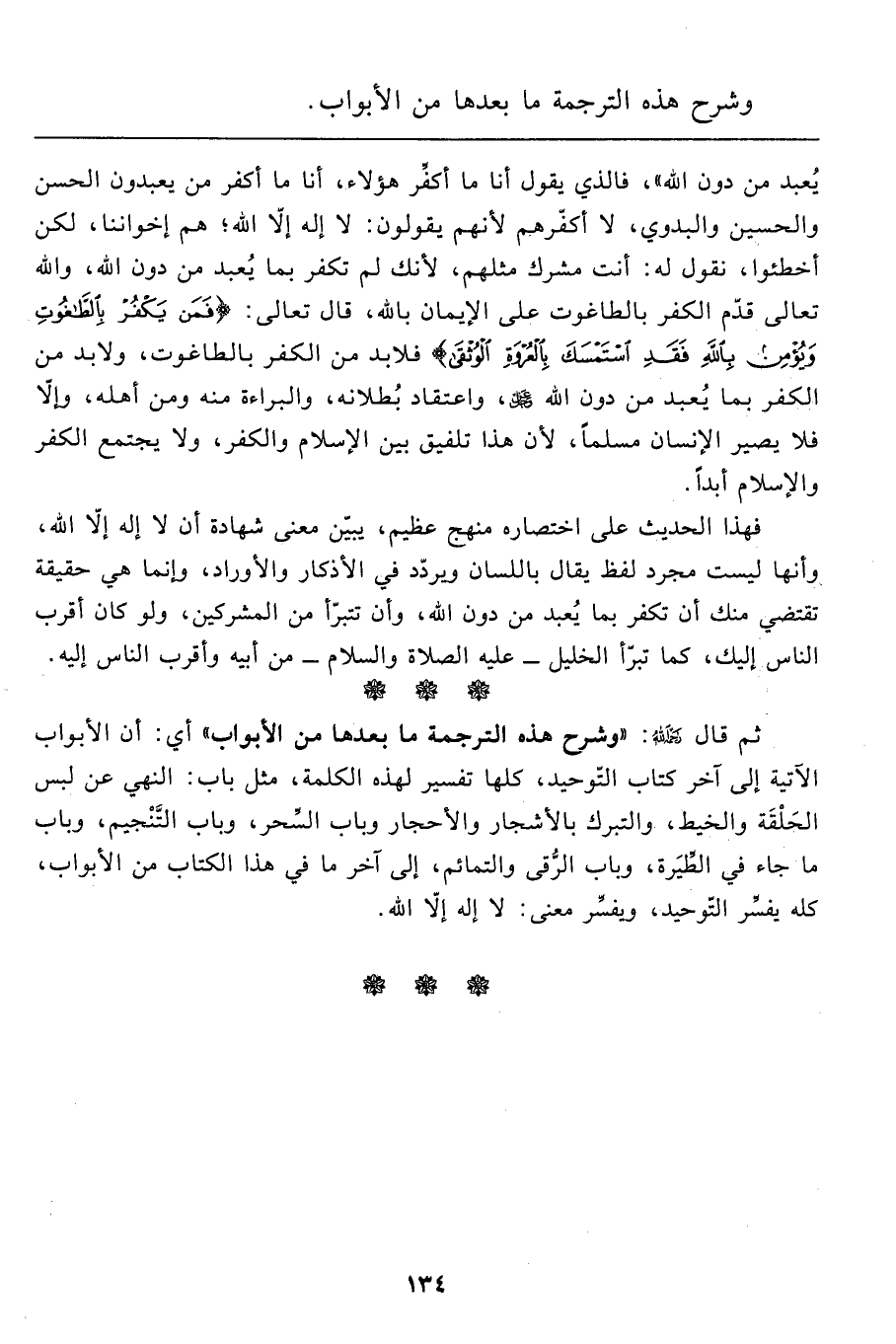 ثم قال رحمه الله: "وشرح هذه الترجمة ما بعدها من الأبواب" أي: أن الأبواب الآتية إلى آخر كتاب التّوحيد، كلها تفسير لهذه الكلمة، مثل باب: النهي عن لبس الحَلْقَة والخيط، والتبرك بالأشجار والأحجار وباب السِّحر، وباب التَّنْجيم، وباب ما جاء في الطِّيَرة، وباب الرُّقى والتمائم، إلى آخر ما في هذا الكتاب من الأبواب، كله يفسِّر التّوحيد، ويفسِّر معنى: لا إله إلاَّ الله.