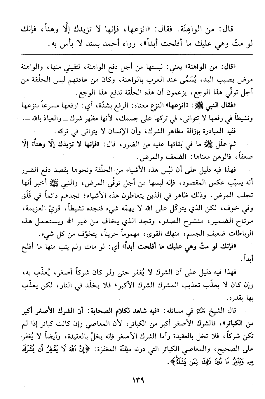 قال: من الواهِنَة. فقال: "انزعها، فإنها لا تزيدك إلاَّ وهناً، فإنك لو متّ وهي عليك ما أفلحت أبداً"، رواه أحمد بسند لا بأس به.