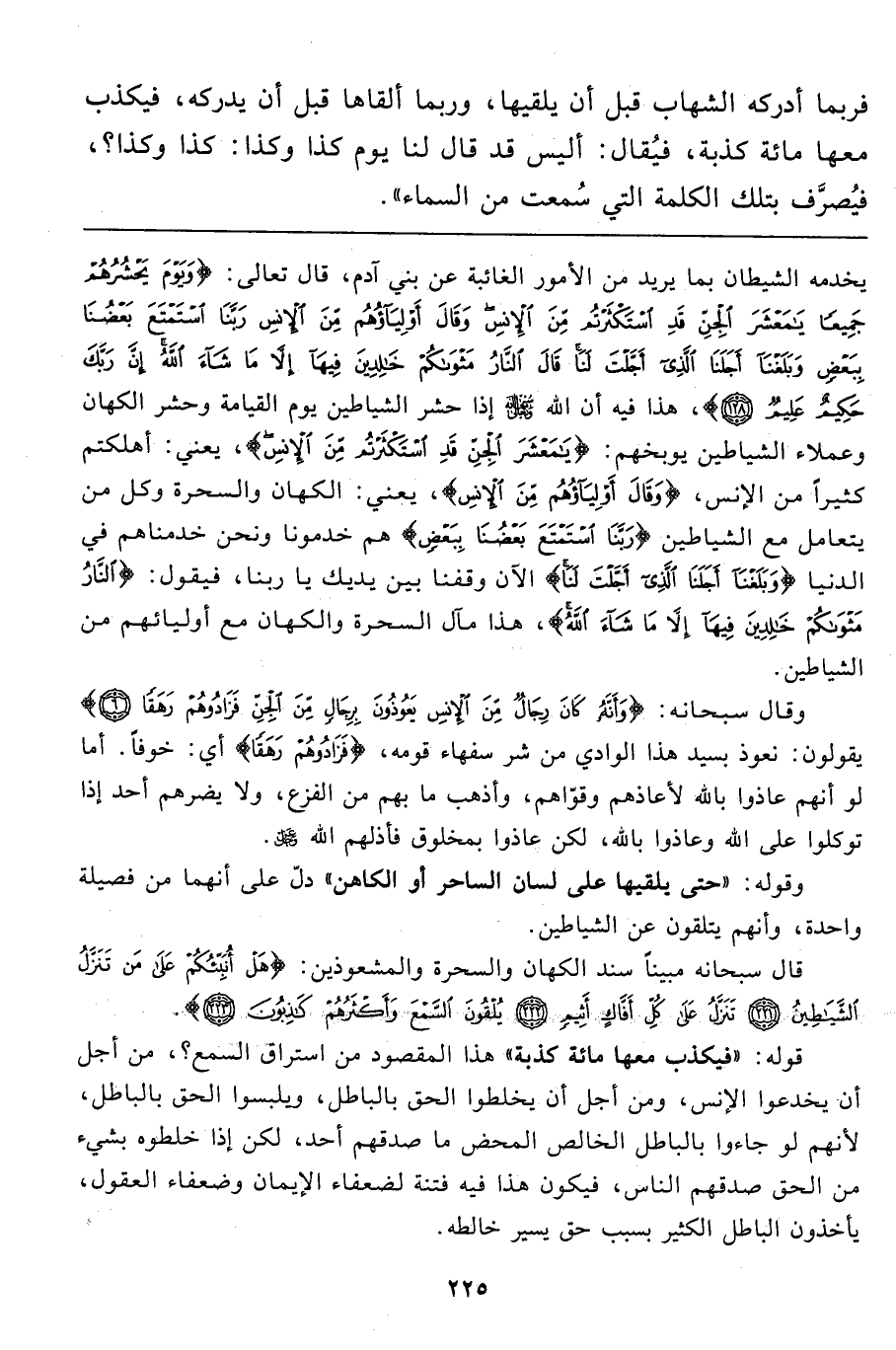 فربما أدركه الشهاب قبل أن يلقيها، وربما ألقاها قبل أن يدركه، فيكذب معها مائة كذبة، فيُقال: أليس قد قال لنا يوم كذا وكذا: كذا وكذا؟، فيُصرَّف بتلك الكلمة التي سُمعت من السماء".