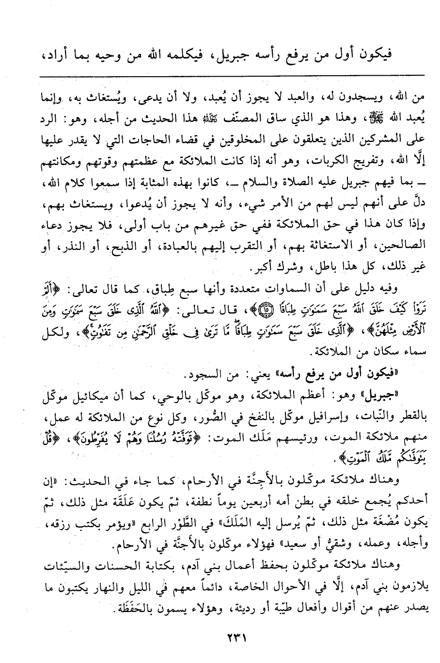 من الله، ويسجدون له، والعبد لا يجوز أن يُعبد، ولا أن يُدعى، ويُستغاث به، وإنما يُعبد الله سبحانه وتعالى، وهذا هو الذي ساق المصنّف رحمه الله هذا الحديث من أجله، وهو: الرد على المشركين الذين يتعلقون على المخلوقين في قضاء الحاجات التي لا يقدر عليها إلاّ الله، وتفريج الكربات، وهو أنه إذا كانت الملائكة مع عظمتهم وقوتهم ومكانتهم -بما فيهم جبريل عليه الصلاة والسلام-، كانوا بهذه المثابة إذا سمعوا كلام الله، دلَّ على أنهم ليس لهم من الأمر شيء، وأنه لا يجوز أن يُدعوا، ويُستغاث بهم، وإذا كان هذا في حق الملائكة ففي حق غيرهم من باب أولى، فلا يجوز دعاء الصالحين، أو الاستغاثة بهم، أو التقرب إليهم بالعبادة، أو الذبح، أو النذر، أو غير ذلك، كل هذا باطل، وشرك أكبر.