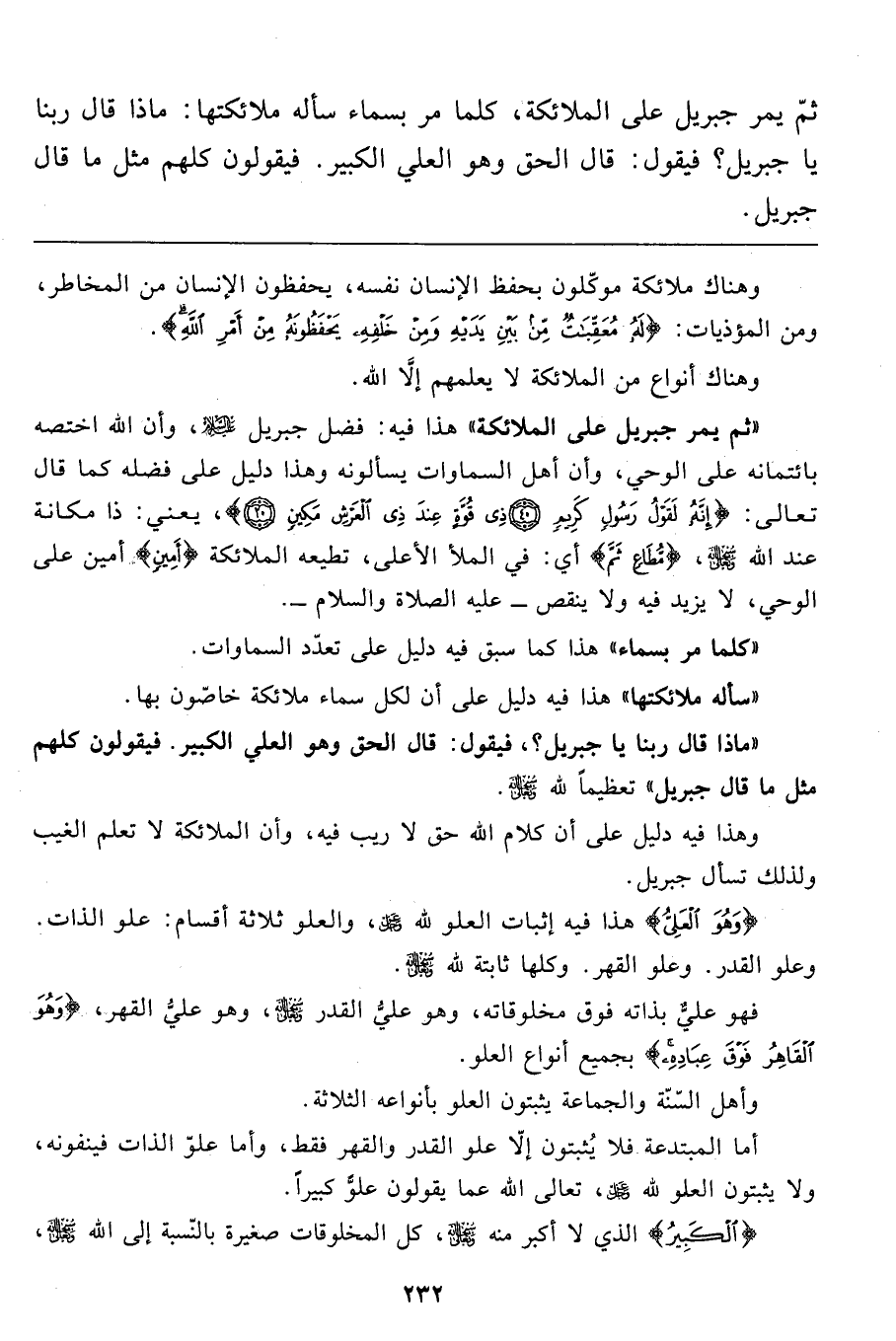 ثمّ يمر جبريل على الملائكة، كلما مر بسماء سأله ملائكتها: ماذا قال ربنا يا جبريل؟ فيقول: قال الحق وهو العلي الكبير. فيقولون كلهم مثل ما قال جبريل.