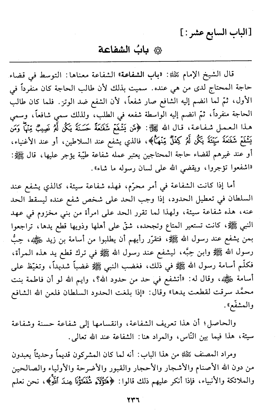 قال الشيخ الإمام رحمه الله: "باب الشفاعة" الشفاعة معناها: التوسط في قضاء حاجة المحتاج لدى من هي عنده. سميت بذلك لأن طالب الحاجة كان منفرداً في الأول، ثمّ لما انضم إليه الشافع صار شفعاً، لأن الشفع ضد الوتر. فلما كان طالب الحاجة منفرداً، ثمّ انضم إليه الواسطة شفعه في الطلب، ولذلك سمّي شافعاً، وسمّي هذا العمل شفاعة، قال الله سبحانه وتعالى: {مَنْ يَشْفَعْ شَفَاعَةً حَسَنَةً يَكُنْ لَهُ نَصِيبٌ مِنْهَا وَمَنْ يَشْفَعْ شَفَاعَةً سَيِّئَةً يَكُنْ لَهُ كِفْلٌ مِنْهَا} ، فالذي يشفع عند السلاطين، أو عند الأغنياء، أو عند غيرهم لقضاء حاجة المحتاجين يعتبر عمله شفاعة طيبة يؤجر عليها، قال صَلَّى اللَّهُ عَلَيْهِ وَسَلَّمَ: "اشفعوا تؤجروا، ويقضي الله على لسان رسوله ما شاء".