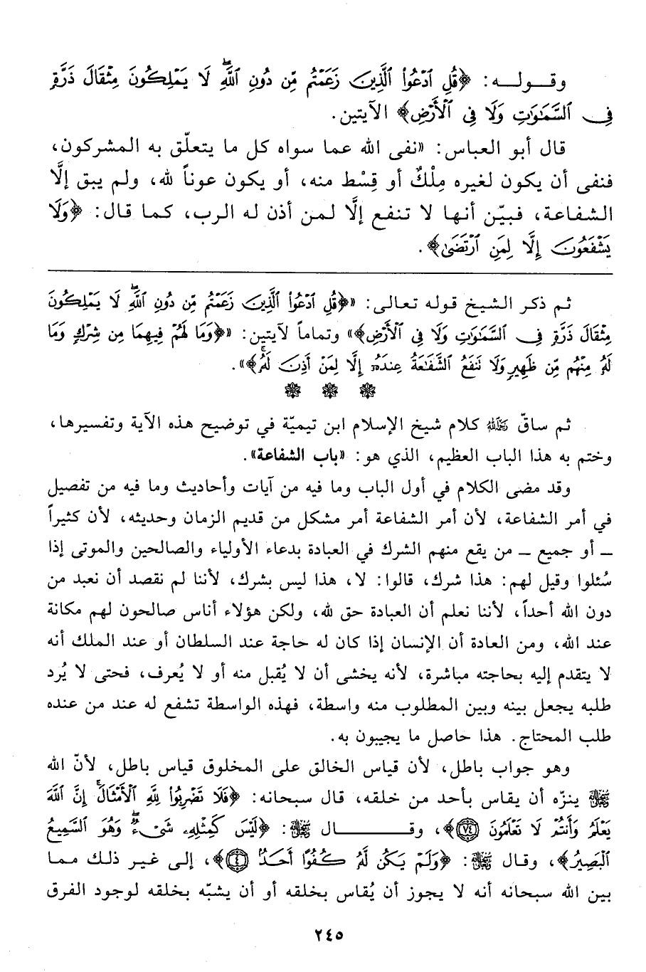 ثم ذكر الشيخ قوله تعالى: {قُلِ ادْعُوا الَّذِينَ زَعَمْتُمْ مِنْ دُونِ اللهِ لا يَمْلِكُونَ مِثْقَالَ ذَرَّةٍ فِي السَّمَاوَاتِ وَلا فِي الْأَرْضِ} ، وتماماً الآيتين: {وَمَا لَهُمْ فِيهِمَا مِنْ شِرْكٍ وَمَا لَهُ مِنْهُمْ مِنْ ظَهِيرٍ*) وَلا تَنْفَعُ الشَّفَاعَةُ عِنْدَهُ إِلَّا لِمَنْ أَذِنَ لَهُ} .