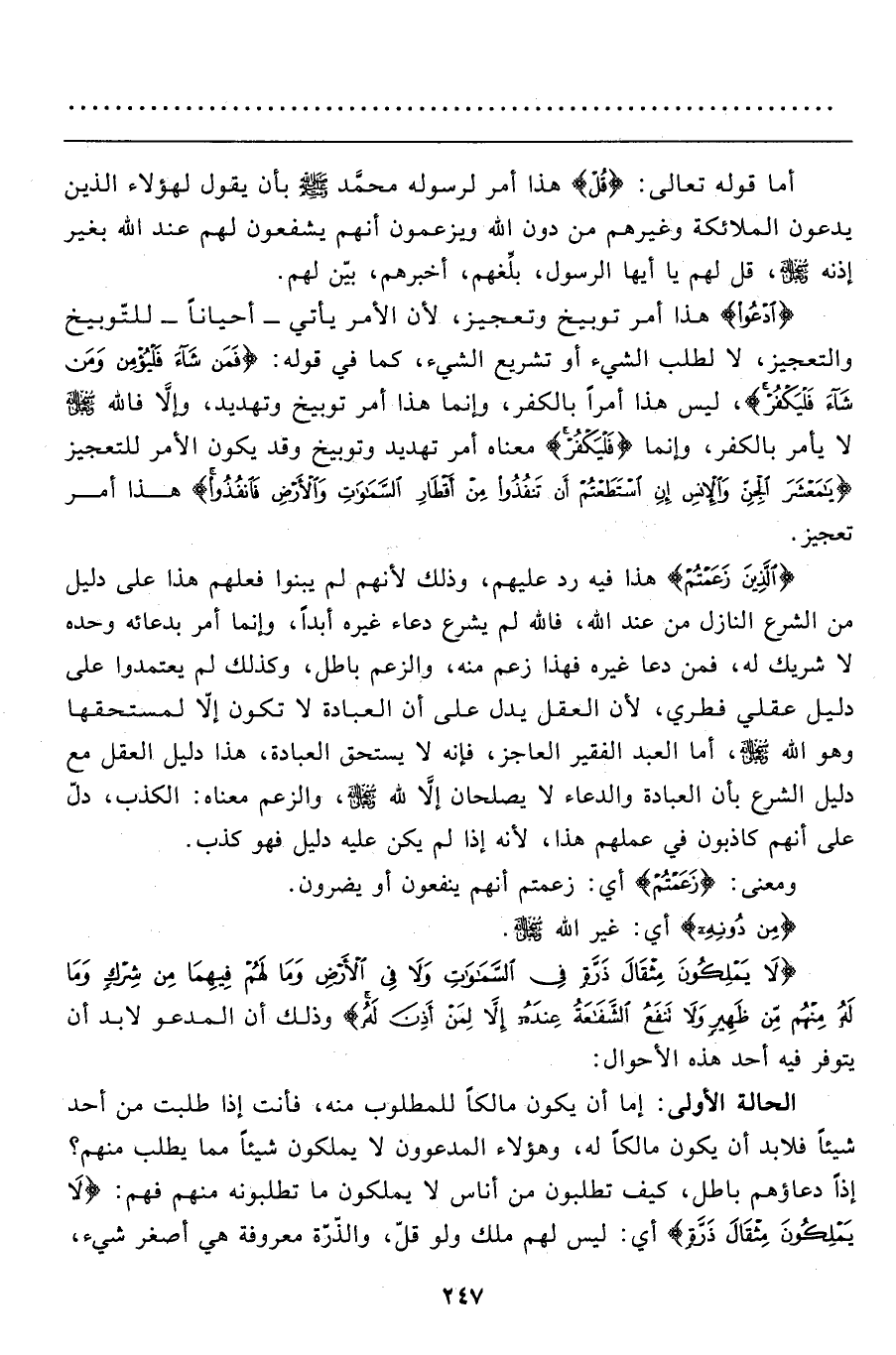 {لا يَمْلِكُونَ مِثْقَالَ ذَرَّةٍ فِي السَّمَاوَاتِ وَلا فِي الْأَرْضِ وَمَا لَهُمْ فِيهِمَا مِنْ شِرْكٍ وَمَا لَهُ مِنْهُمْ مِنْ ظَهِيرٍ (22) وَلا تَنْفَعُ الشَّفَاعَةُ عِنْدَهُ إِلَّا لِمَنْ أَذِنَ لَهُ} ، وذلك أن المدعو لابد أن يتوفر فيه أحد هذه الأحوال:
