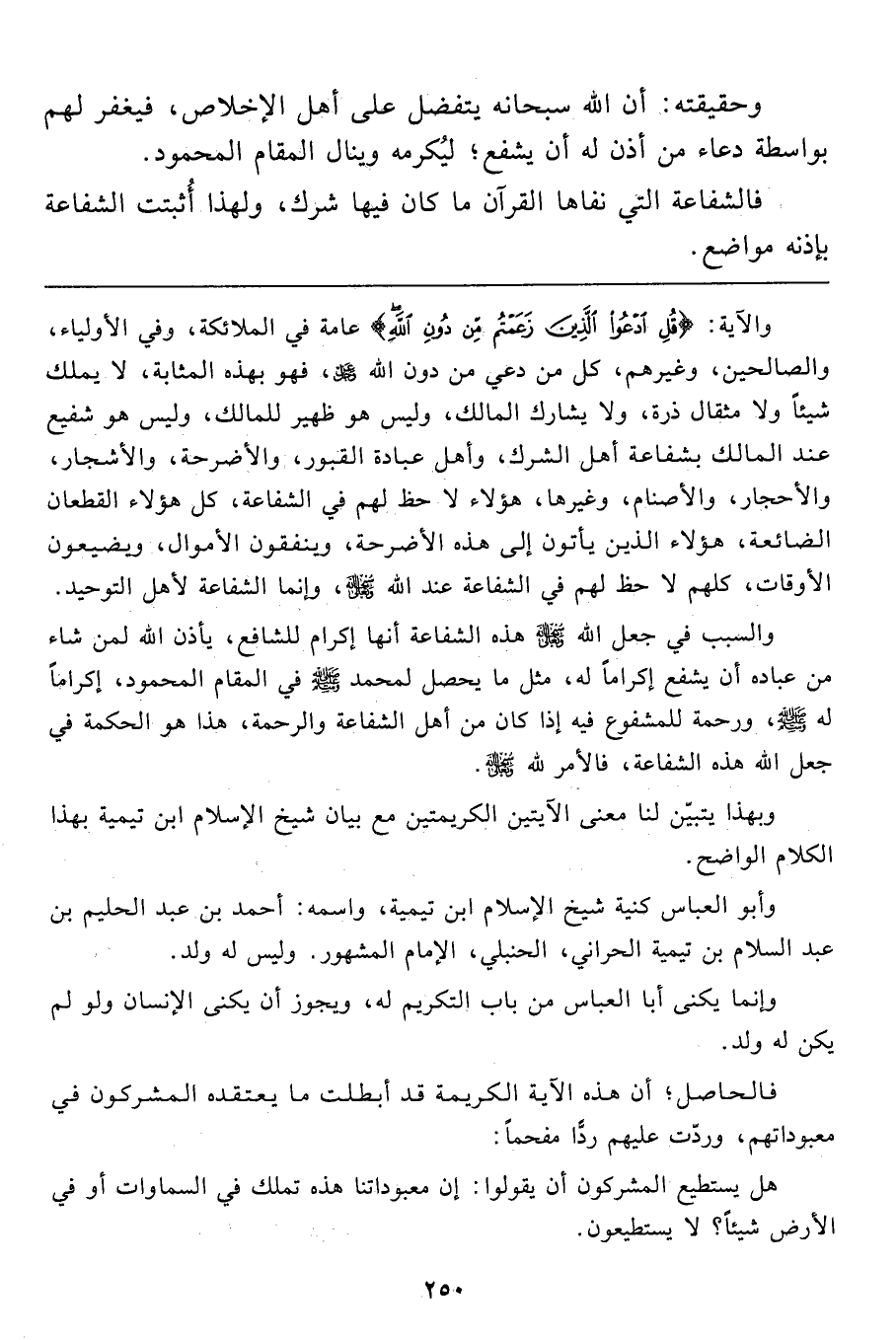 والآية: {قُلِ ادْعُوا الَّذِينَ زَعَمْتُمْ مِنْ دُونِ اللهِ} ، عامة في الملائكة، وفي الأولياء، والصالحين، وغيرهم، كل من دُعي من دون الله عزّ وجلّ، فهو بهذه المثابة، لا يملك شيئاً ولا مثقال ذرة، ولا يشارك المالك، وليس هو ظهير للمالك، وليس هو شفيع عند المالك بشفاعة أهل الشرك، وأهل عبادة القبور، والأضرحة، والأشجار، والأحجار، والأصنام، وغيرها، هؤلاء لا حظ لهم في الشفاعة، كل هؤلاء القطعان الضائعة، هؤلاء الذين يأتون إلى هذه الأضرحة، وينفقون الأموال، ويضيعون الأوقات، كلهم لا حظ لهم في الشفاعة عند الله سبحانه وتعالى، وإنما الشفاعة لأهل التّوحيد.