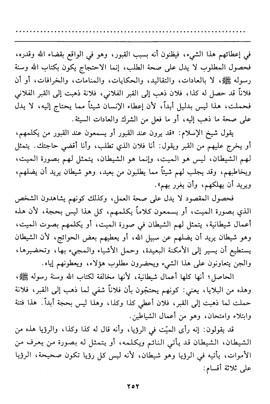 قد يقولون: إنه رأى الميّت في الرؤيا، وأنه قال له كذا وكذا، والرؤيا هذه من الشيطان، الشيطان قد يأتي النائم ويكلمه، أو يتمثل له بصورة من يعرف من الأموات، يأتيه في الرؤيا وهو شيطان، لأنه ليس كل رؤيا تكون صحيحة، الرؤيا على ثلاثة أقسام: