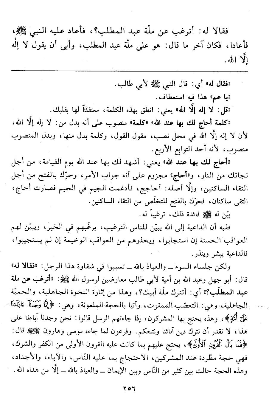 فقالا له: أترغب عن ملّة عبد المطلب؟، فأعاد عليه النبي صَلَّى اللَّهُ عَلَيْهِ وَسَلَّمَ، فأعادا، فكان آخر ما قال: هو على ملّة عبد المطلب، وأبى أن يقول لا إله إلاّ الله.