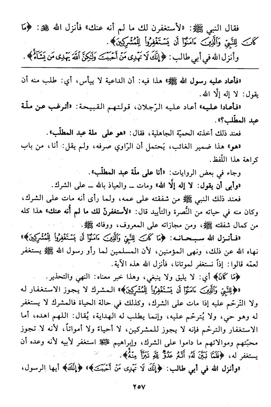 "فأنزل الله سبحانه: {مَا كَانَ لِلنَّبِيِّ وَالَّذِينَ آمَنُوا أَنْ يَسْتَغْفِرُوا لِلْمُشْرِكِينَ} " نهاه الله عن ذلك، ونهى المؤمنين، لأن المسلمين لما رأوا رسول الله صَلَّى اللَّهُ عَلَيْهِ وَسَلَّمَ يستغفر لعمّه قالوا: إذاً نستغفر لموتانا، فأنزل الله هذه الآية.