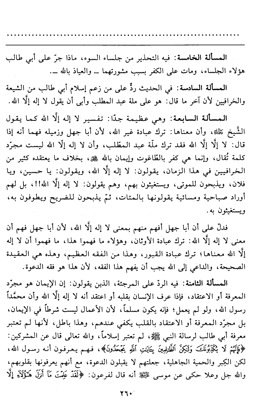 المسألة السادسة: في الحديث ردٌّ على من زعم إسلام أبي طالب من الشيعة والخرافيين لأن آخر ما قال: هو على ملة عبد المطلب وأبى أن يقول لا إله إلاّ الله.