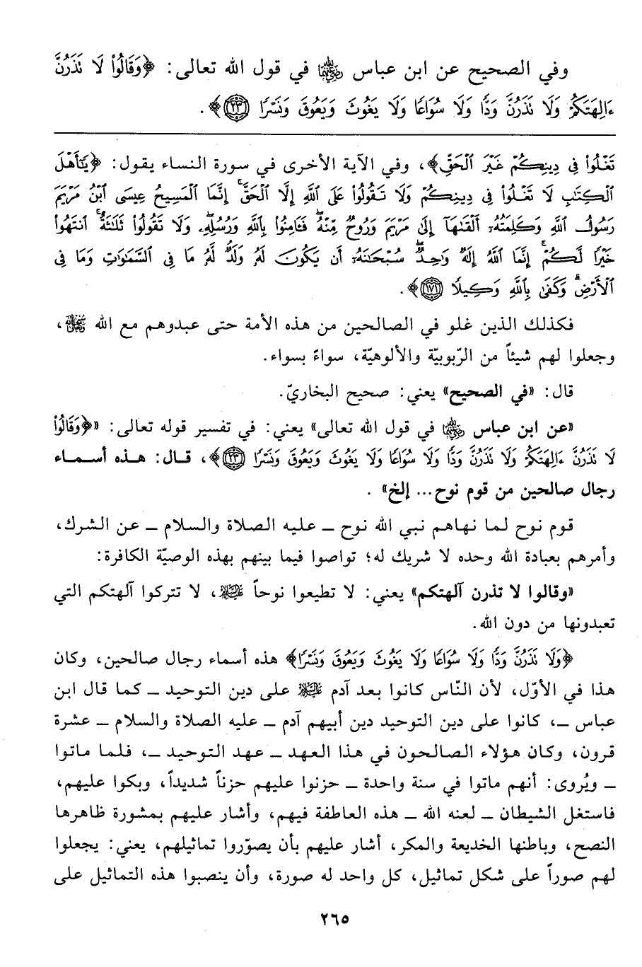 وفي الصحيح عن ابن عباس رضي الله عنه في قول الله تعالى: {وَقَالُوا لا تَذَرُنَّ آلِهَتَكُمْ وَلا تَذَرُنَّ وَدّاً وَلا سُوَاعاً وَلا يَغُوثَ وَيَعُوقَ وَنَسْراً (23) } .