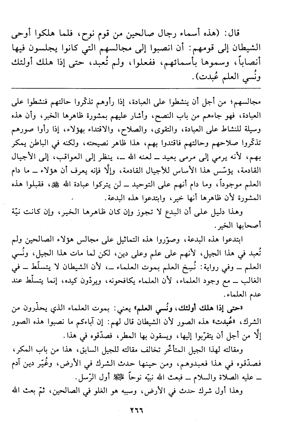 ابتدعوا هذه البدعة، وصوّروا هذه التماثيل على مجالس هؤلاء الصالحين ولم تُعبد في هذا الجيل، لأنهم على علم وعلى دين، لكن لما مات هذا الجيل، ونُسي العلم- وفي رواية: نُسِخ العلم بموت العلماء-، لأن الشيطان لا يتسلّط- في الغالب- مع وجود العلماء، لأن العلماء يكافحونه، ويردّون كيده، إنما يتسلّط عند عدم العلماء.