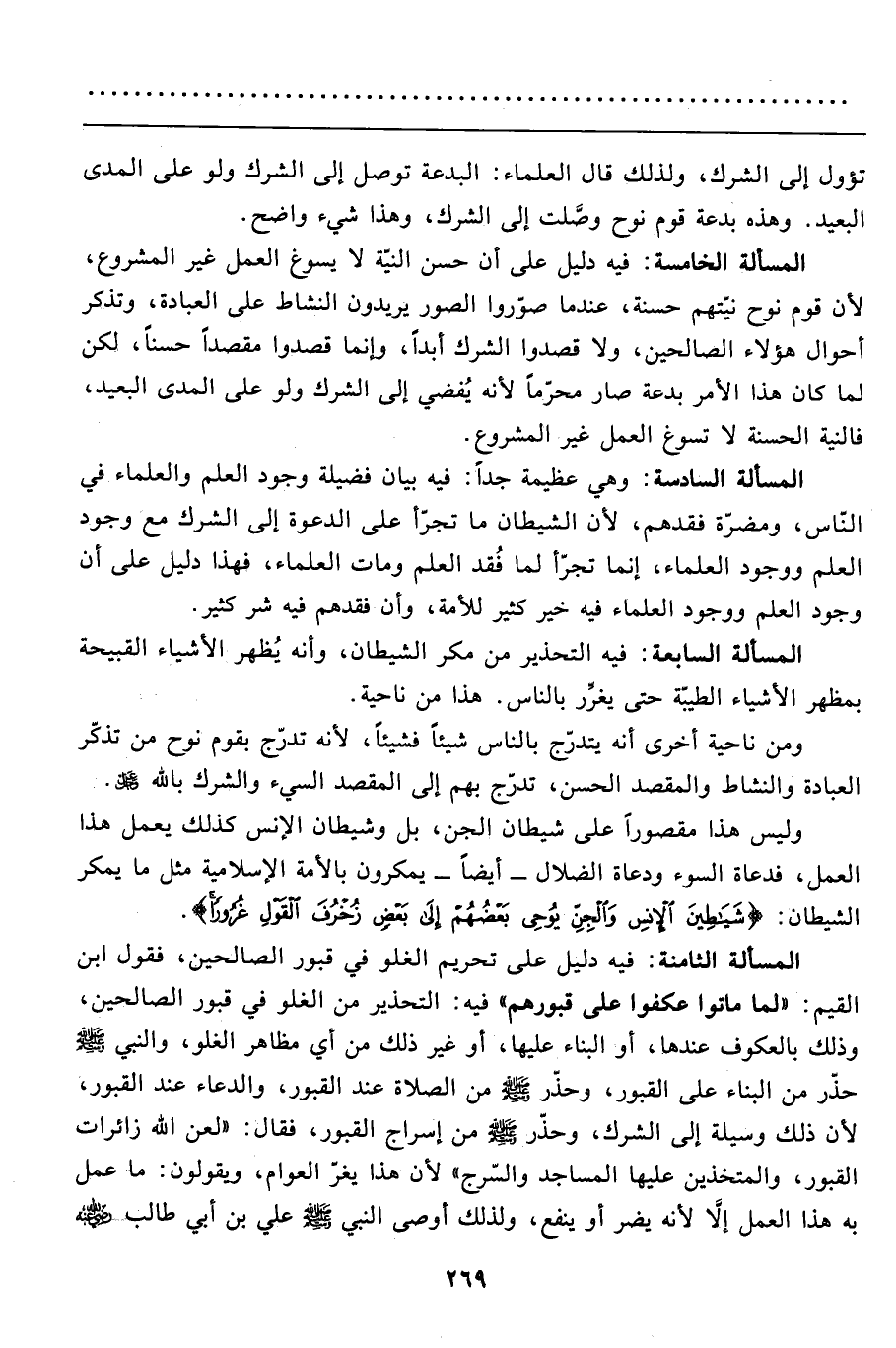 المسألة الثامنة: فيه دليل على تحريم الغلو في قبور الصالحين،، فقول ابن القيم: "لما ماتوا عكفوا على قبورهم" فيه: التحذير من الغلو في قبور الصالحين، وذلك بالعكوف عندها، أو البناء عليها، أو غير ذلك من أي مظاهر الغلو، والنبي صَلَّى اللَّهُ عَلَيْهِ وَسَلَّمَ حذّر من البناء على القبور، وحذّر صَلَّى اللَّهُ عَلَيْهِ وَسَلَّمَ من الصلاة عند القبور، والدعاء عند القبور، لأن ذلك وسيلة إلى الشرك، وحذّر صَلَّى اللَّهُ عَلَيْهِ وَسَلَّمَ من إسراج القبور، فقال: "لعن الله زائرات القبور، والمتخذين عليها المساجد والسّرج" لأن هذا يغرّ العوام، ويقولون: ما عمل به هذا العمل إلاّ لأنه يضر أو ينفع، ولذلك أوصى النبي صَلَّى اللَّهُ عَلَيْهِ وَسَلَّمَ علي بن أبي طالب رضي الله عنه