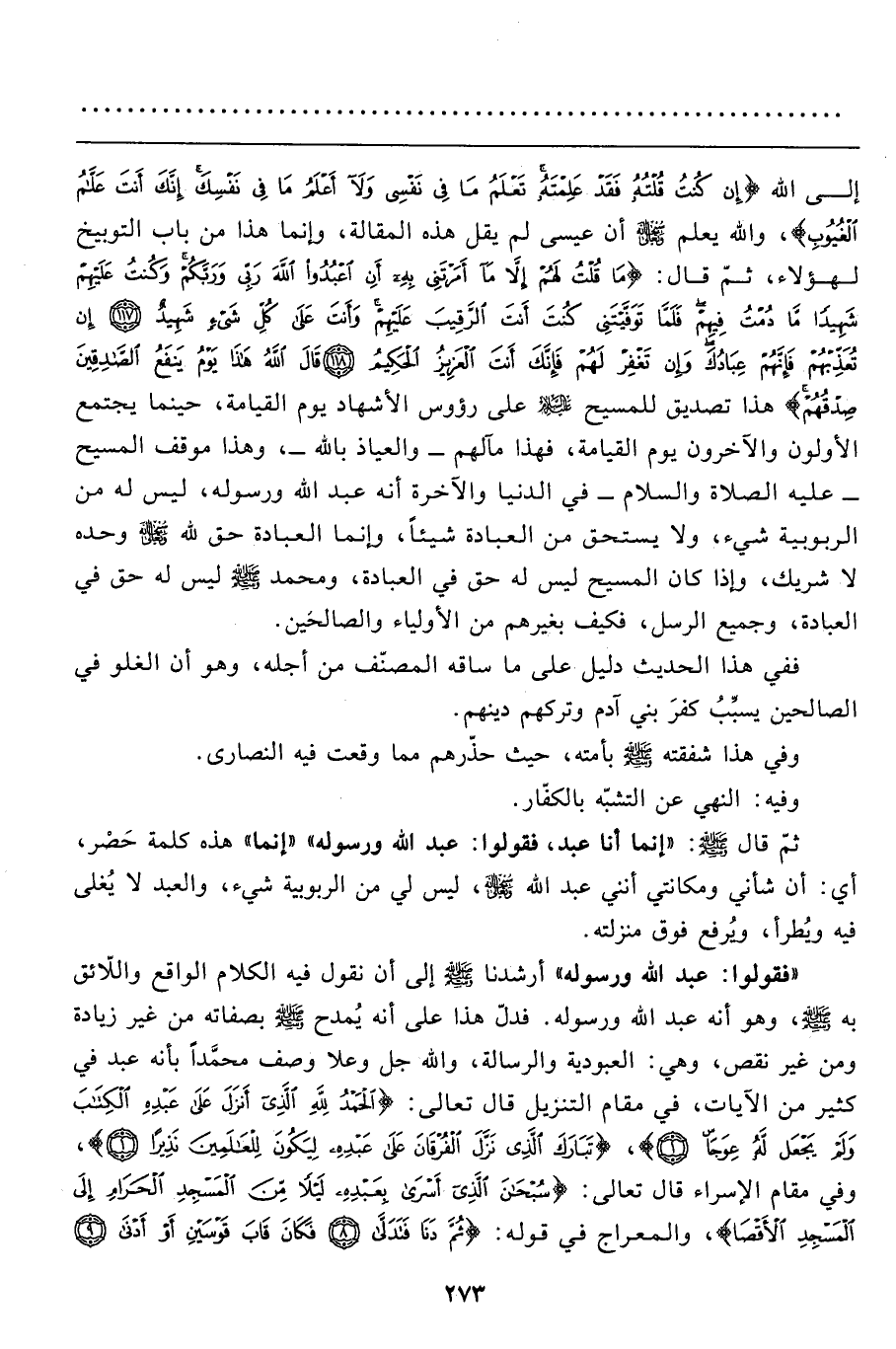 إلى الله {إِنْ كُنْتُ قُلْتُهُ فَقَدْ عَلِمْتَهُ تَعْلَمُ مَا فِي نَفْسِي وَلا أَعْلَمُ مَا فِي نَفْسِكَ إِنَّكَ أَنْتَ عَلَّامُ الْغُيُوبِ} ، والله يعلم سبحانه وتعالى أن عيسى لم يقل هذه المقالة، وإنما هذا من باب التوبيخ لهؤلاء، ثمّ قال: {مَا قُلْتُ لَهُمْ إِلَّا مَا أَمَرْتَنِي بِهِ أَنِ اعْبُدُوا اللهَ رَبِّي وَرَبَّكُمْ وَكُنْتُ عَلَيْهِمْ شَهِيداً مَا دُمْتُ فِيهِمْ فَلَمَّا تَوَفَّيْتَنِي كُنْتَ أَنْتَ الرَّقِيبَ عَلَيْهِمْ وَأَنْتَ عَلَى كُلِّ شَيْءٍ شَهِيدٌ (117) إِنْ تُعَذِّبْهُمْ فَإِنَّهُمْ عِبَادُكَ وَإِنْ تَغْفِرْ لَهُمْ فَإِنَّكَ أَنْتَ الْعَزِيزُ الْحَكِيمُ (118) قَالَ اللهُ هَذَا يَوْمُ يَنْفَعُ الصَّادِقِينَ صِدْقُهُمْ} هذا تصديق للمسيح عليه السلام على رؤوس الأشهاد يوم القيامة، حينما يجتمع الأولون والآخرون يوم القيامة، فهذا مآلهم -والعياذ بالله-، وهذا موقف المسيح - عليه الصلاة والسلام- في الدنيا والآخرة أنه عبد الله ورسوله، ليس له من الربوبية شيء، ولا يستحق من العبادة شيئاً، وإنما العبادة حق لله سبحانه وتعالى وحده لا شريك، وإذا كان المسيح ليس له حق في العبادة، ومحمد صَلَّى اللَّهُ عَلَيْهِ وَسَلَّمَ ليس له حق في العبادة، وجميع الرسل، فكيف بغيرهم من الأولياء والصالحين.